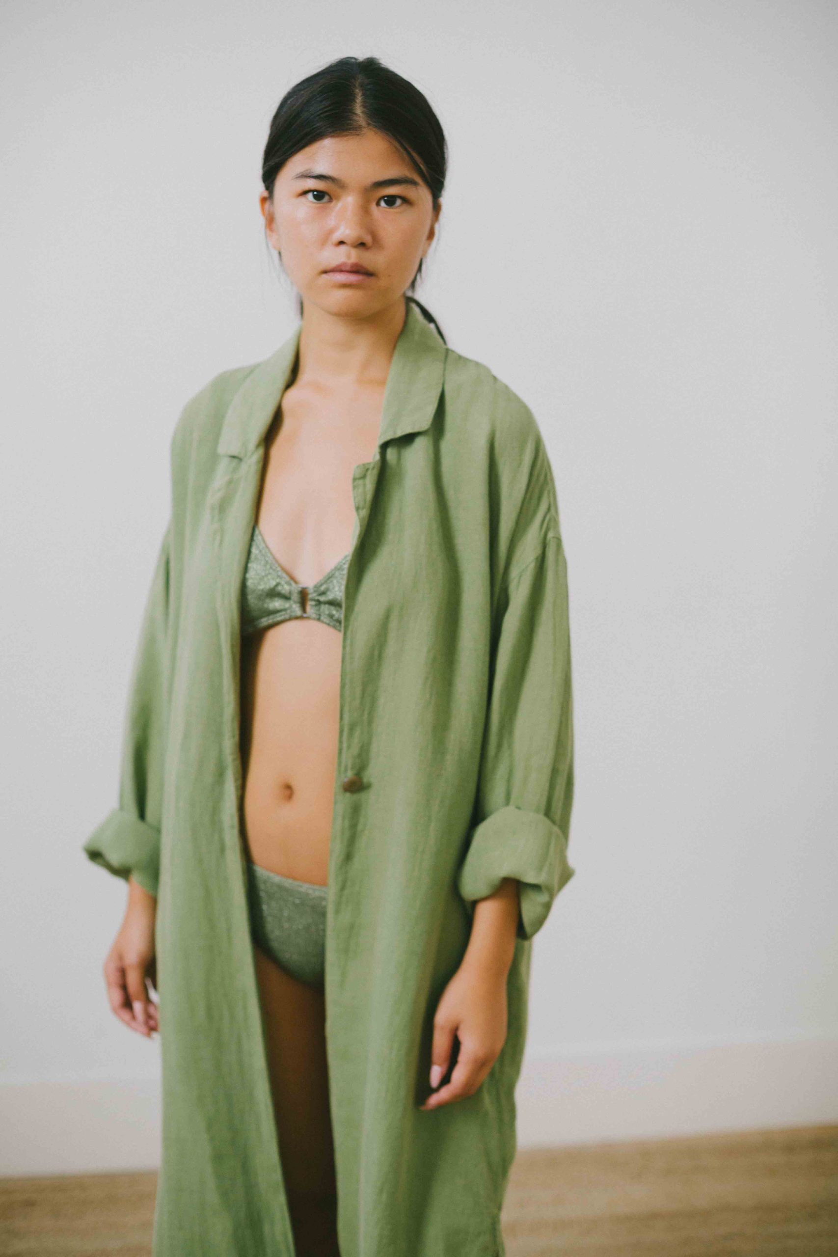 Gabardina verde agua larga con cinturón, botones y bolsillos