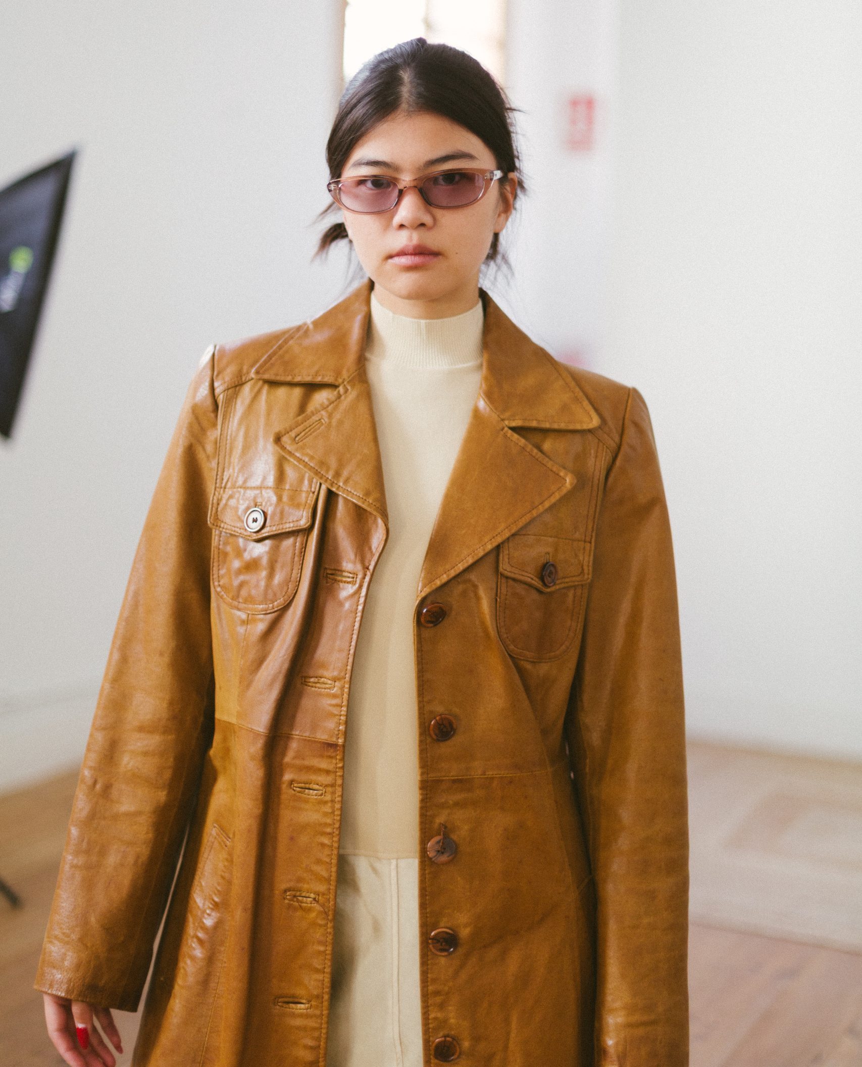 La piel se lleva en proporciones amplias. Hombros marcados, cortes rectos, volúmenes que caen con autoridad.