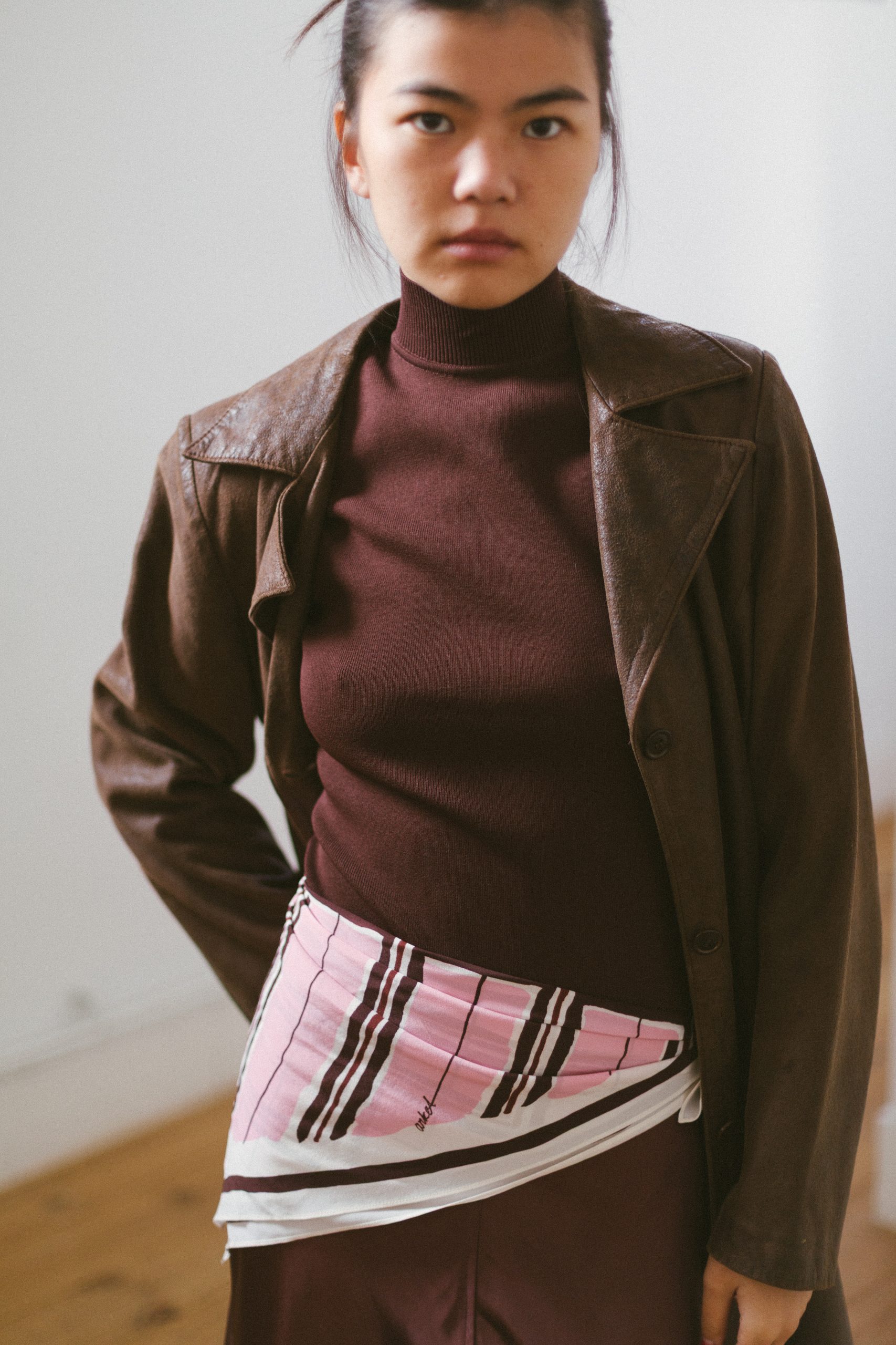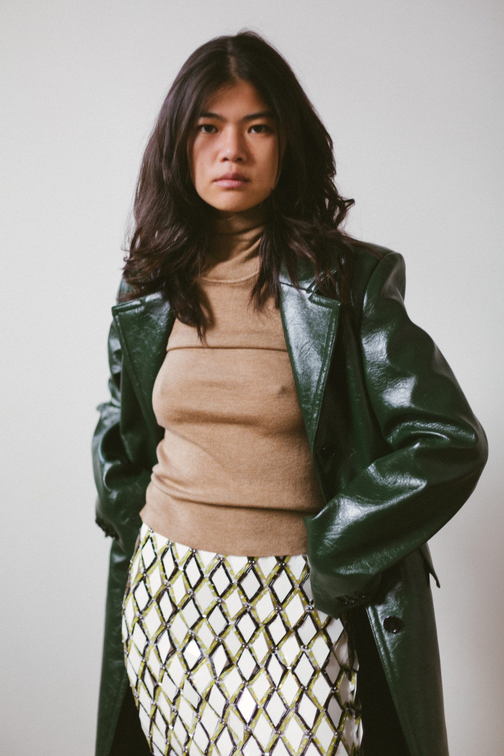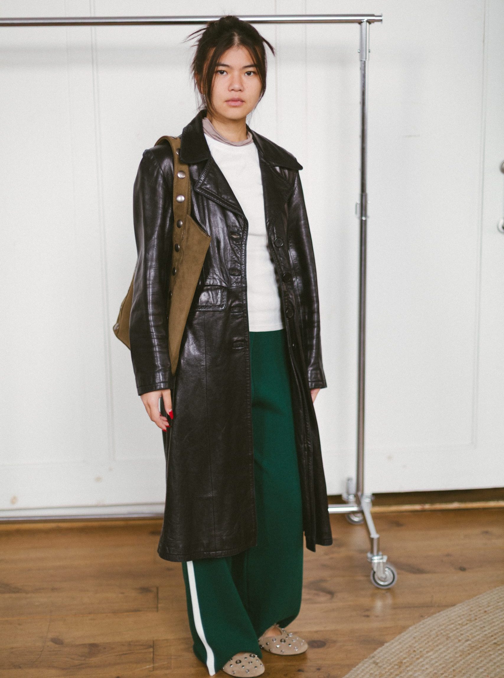 A esta lógica se suma la combinación de piel oversize con punto fino, donde la estructura contundente de la prenda exterior se equilibra con la ligereza de las capas interiores.