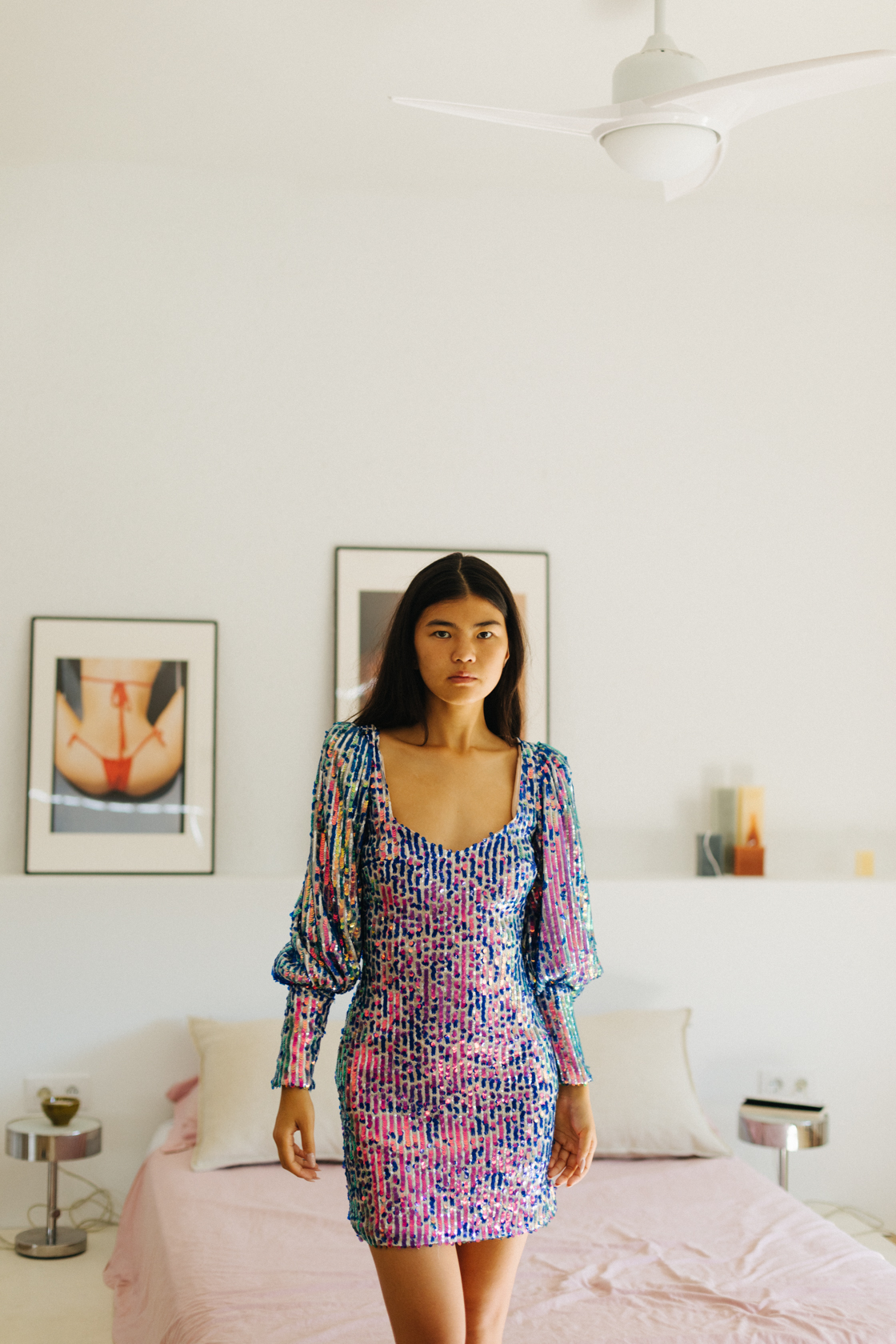 Vestido corto pailette multicolor con manga jamón y puño alargado con escote cuadrado- S- ZARA