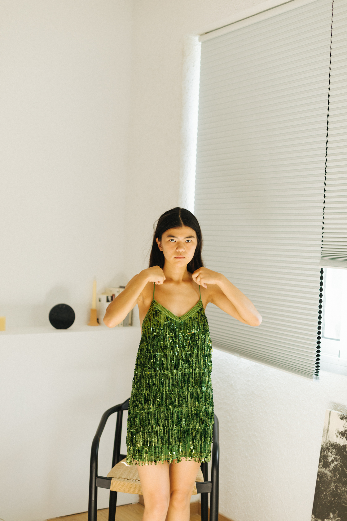 Vestido corto de flecos de paillette de color verde- S- Pull & Bear