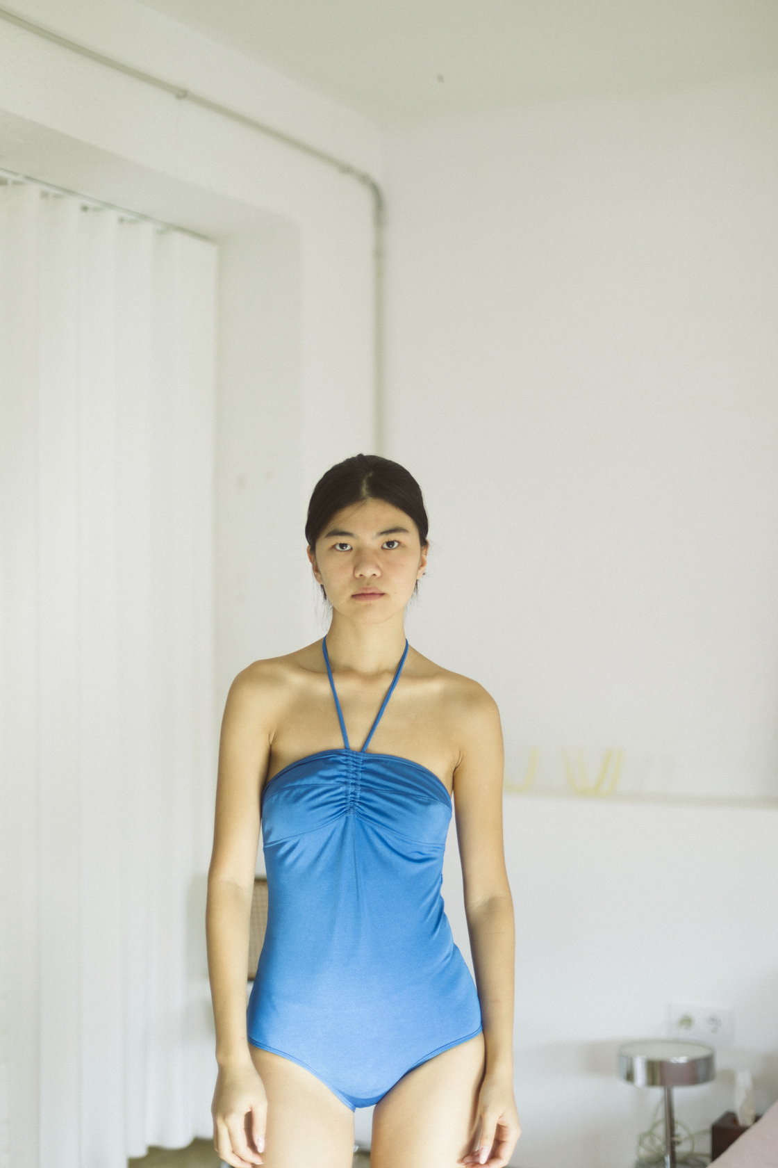 Bañador azul con fruncido en el pecho atado al cuello