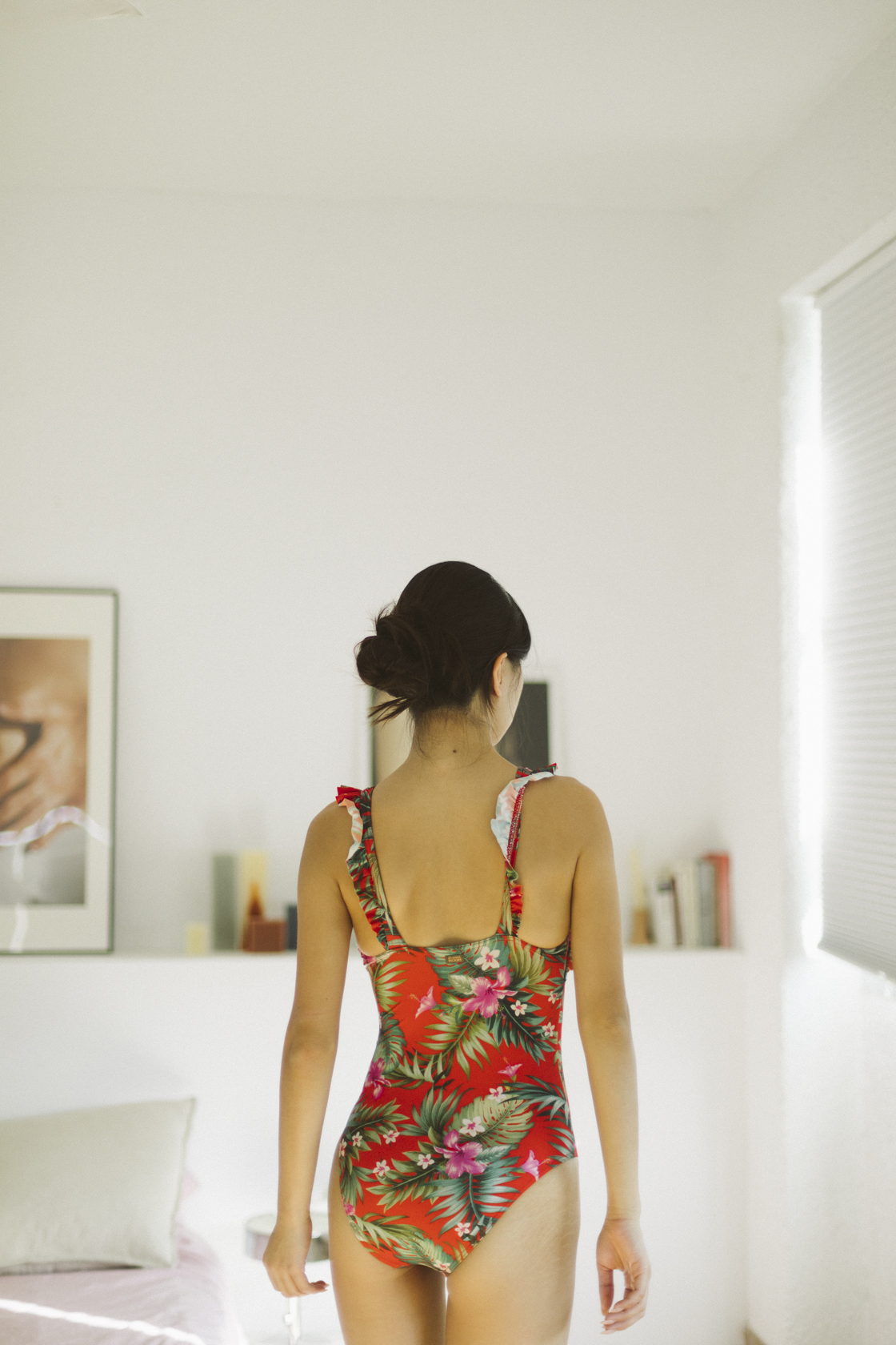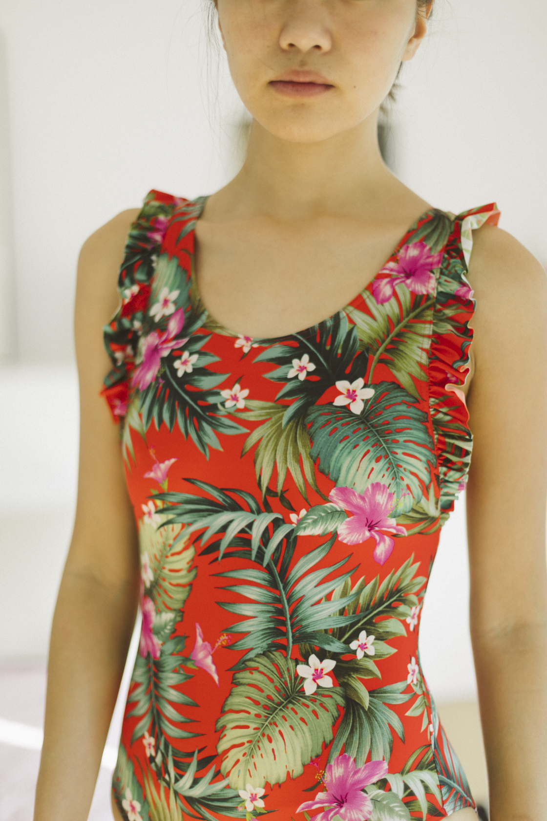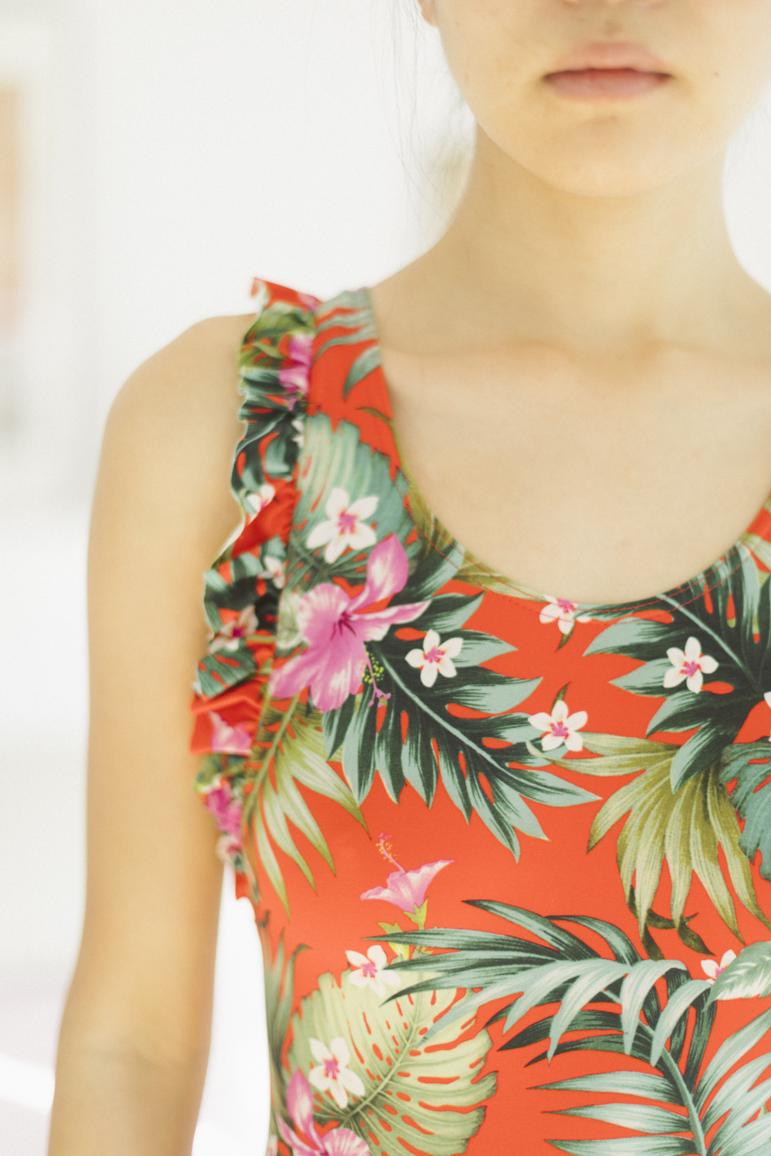 Bañador rojo con estampado floral y las tiras con volantes