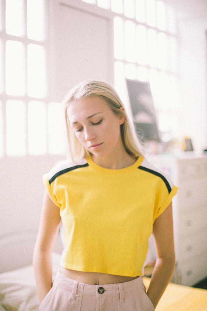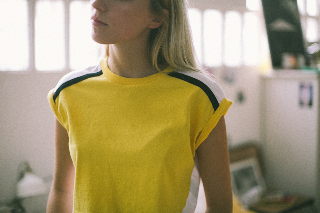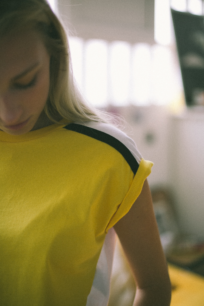 camiseta amarilla corta rayas hombro