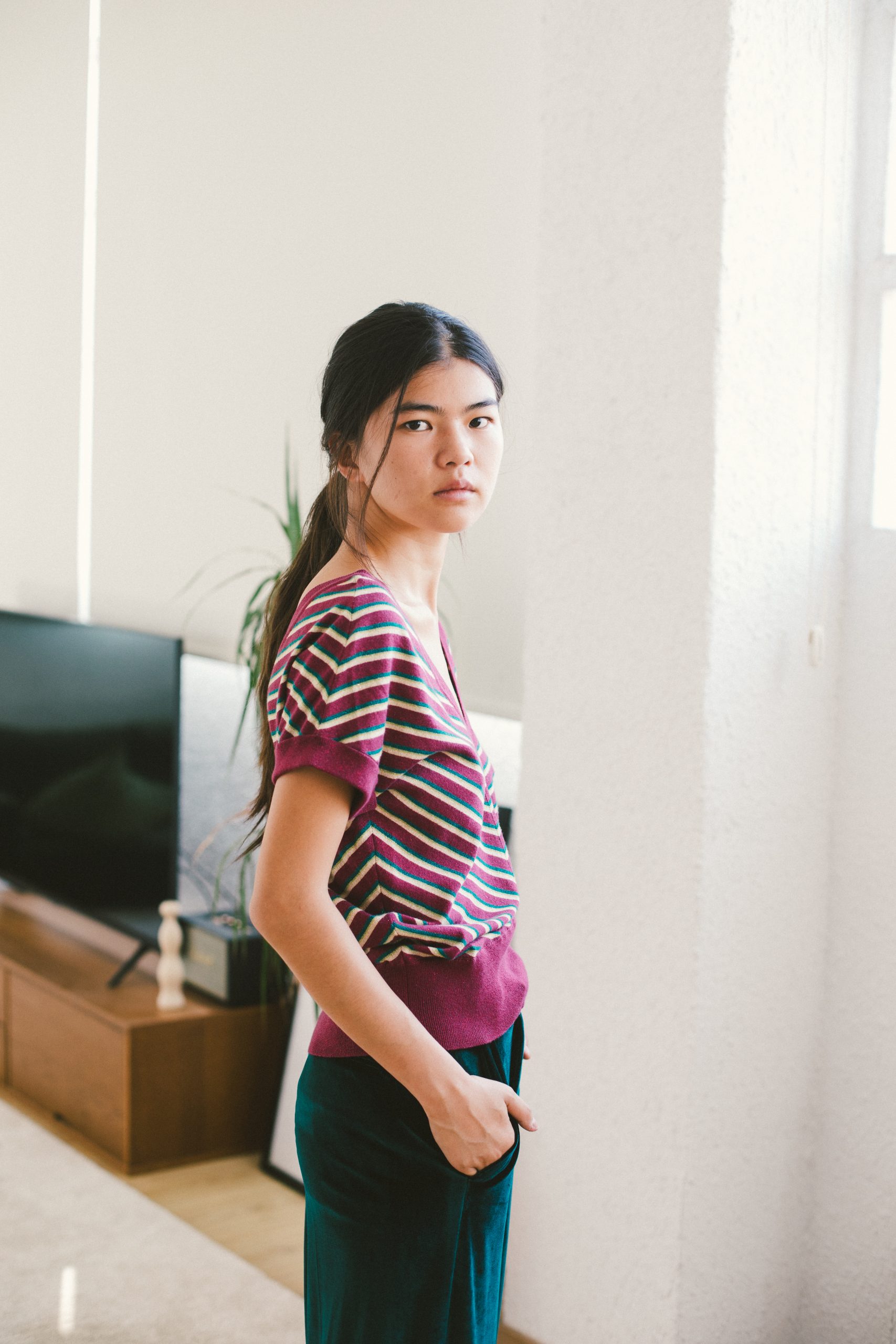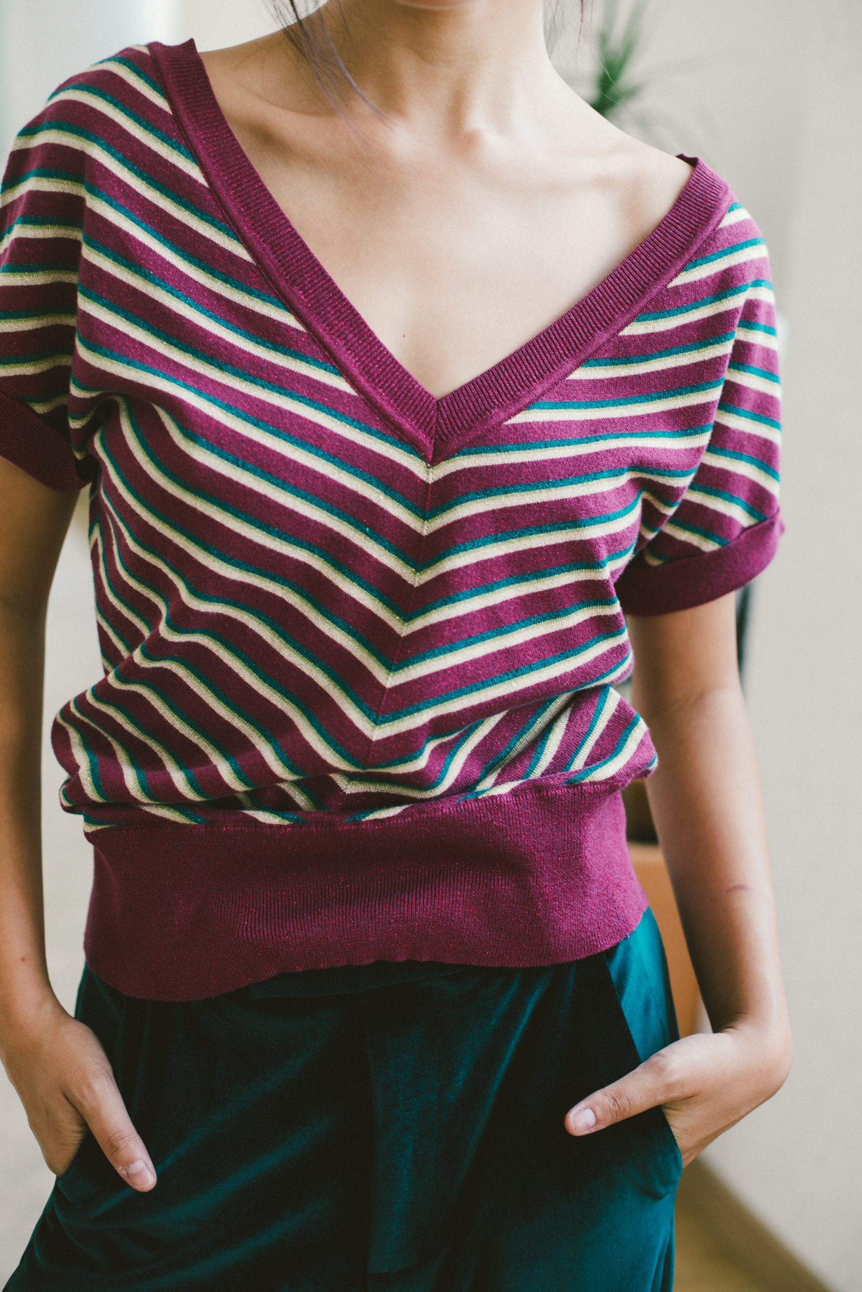 Camiseta manga corta de rayas berenjena