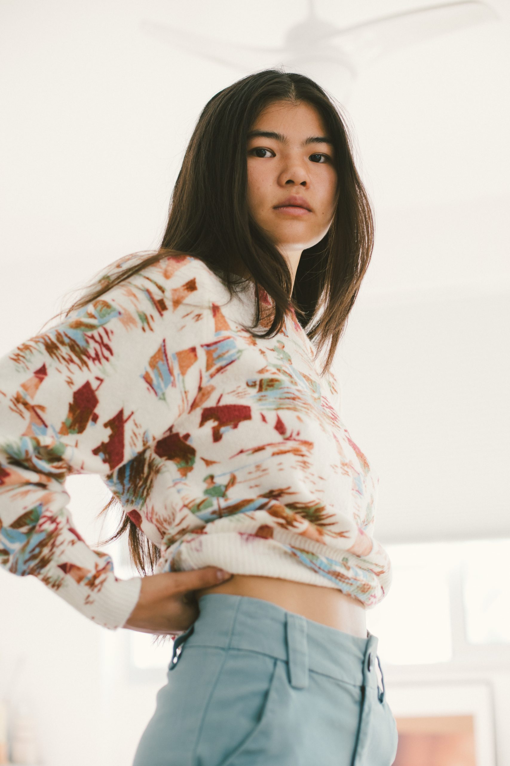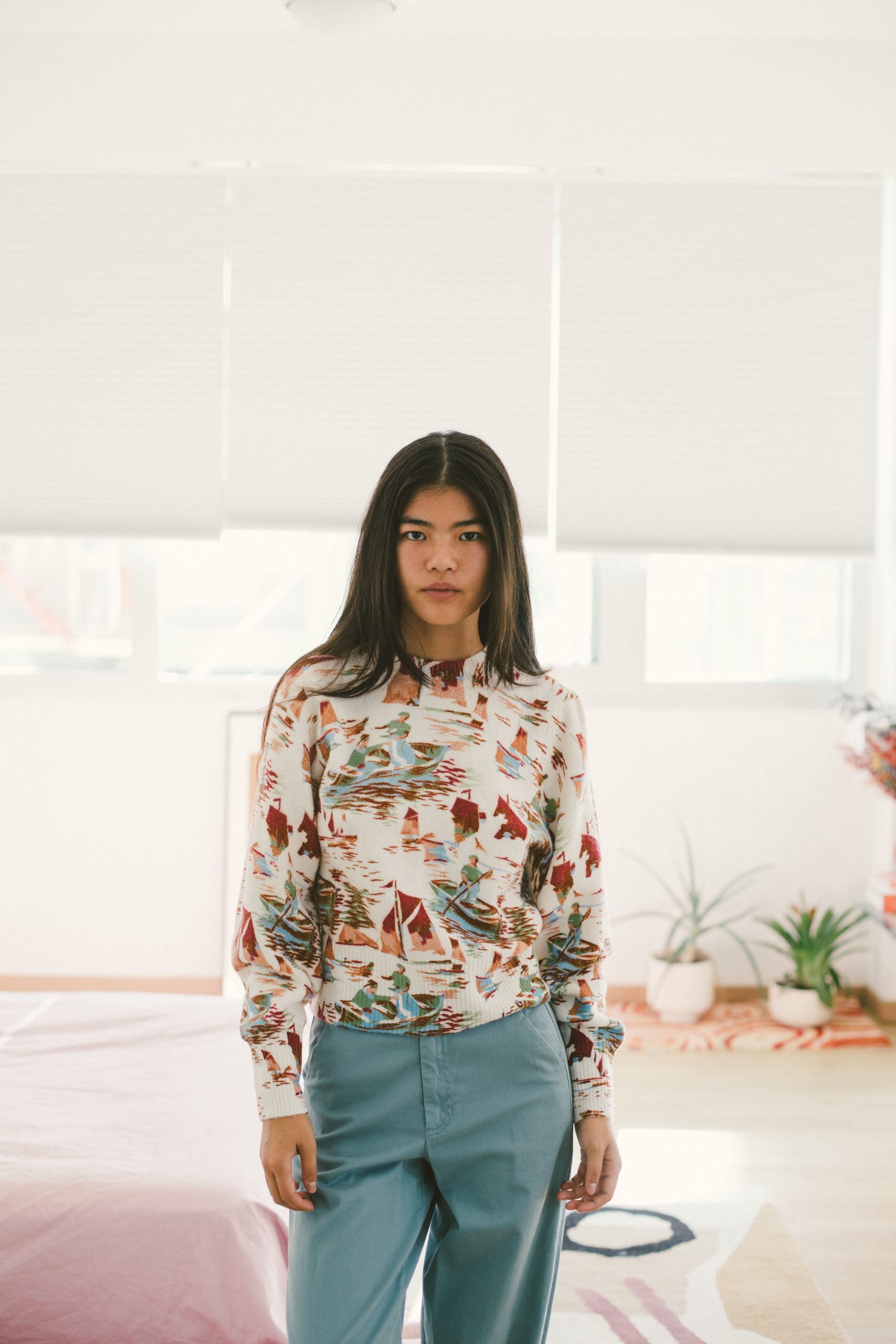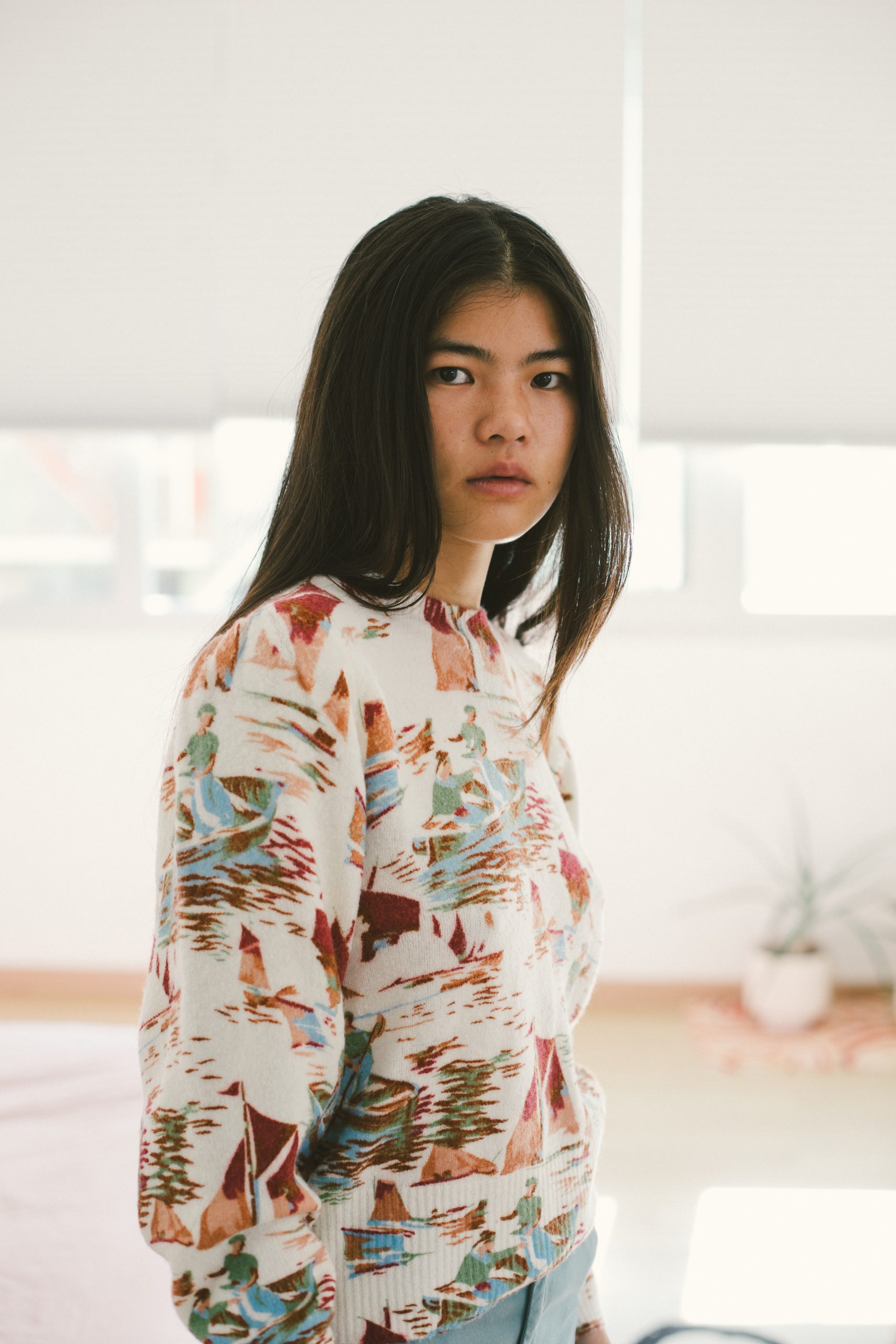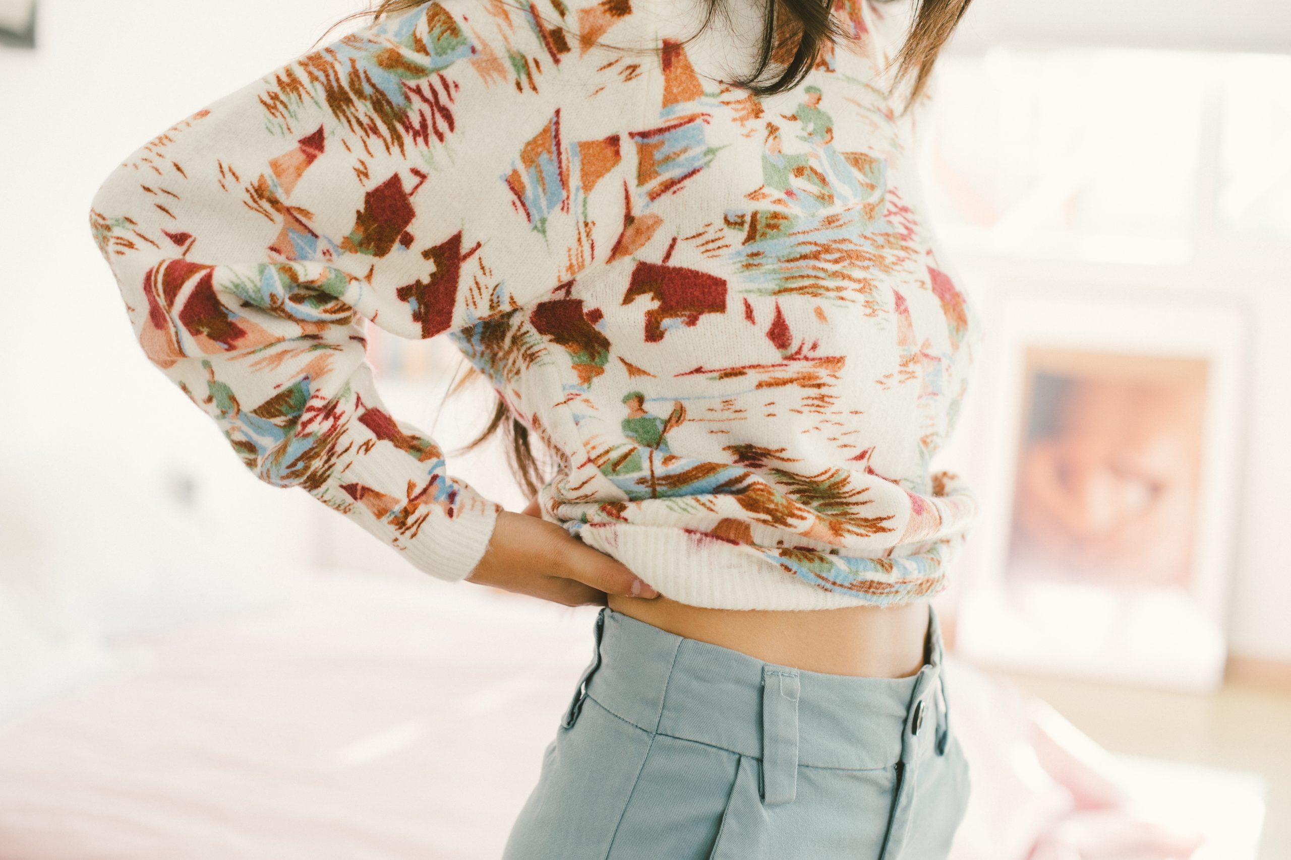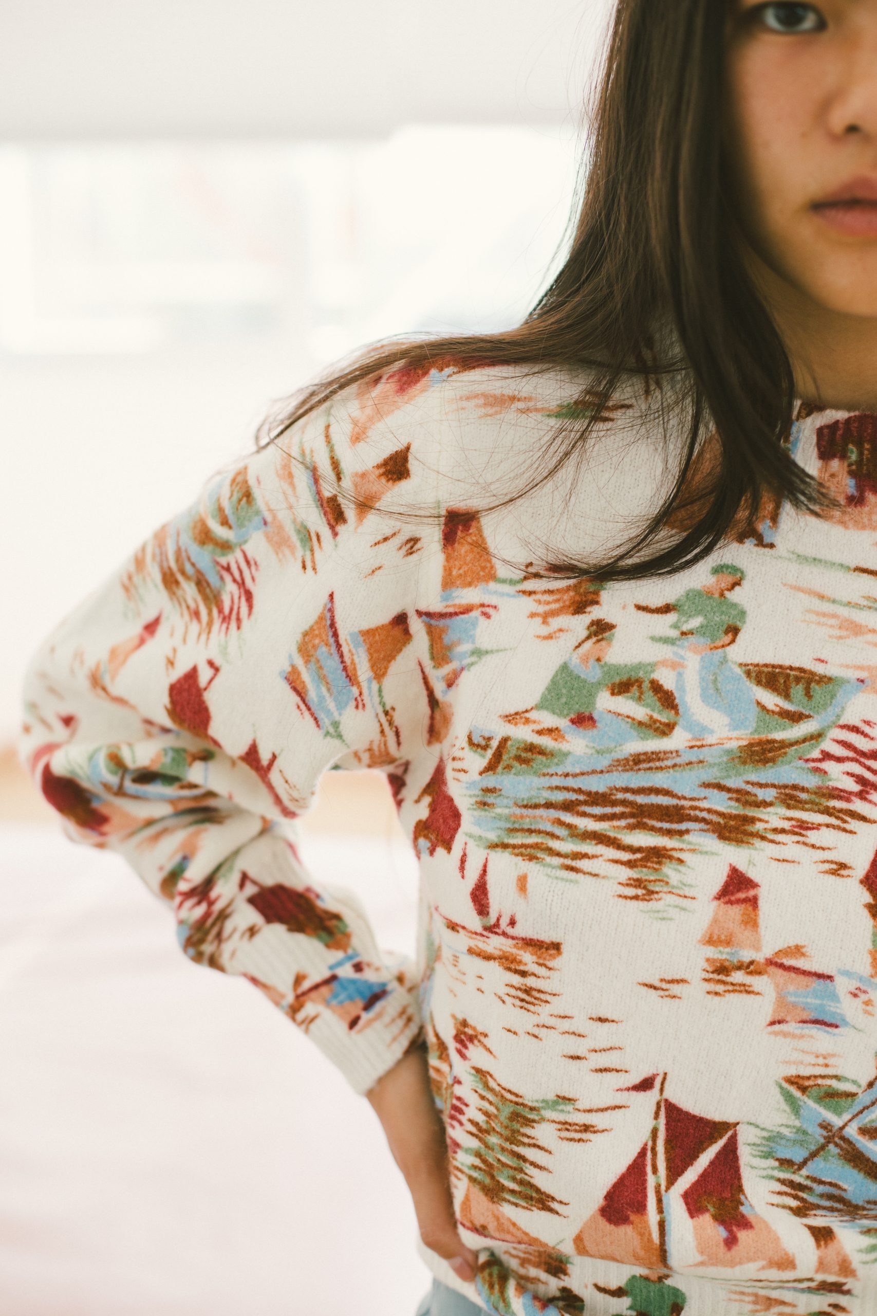 Jersey blanco con estampado multicolor de cuello redondo