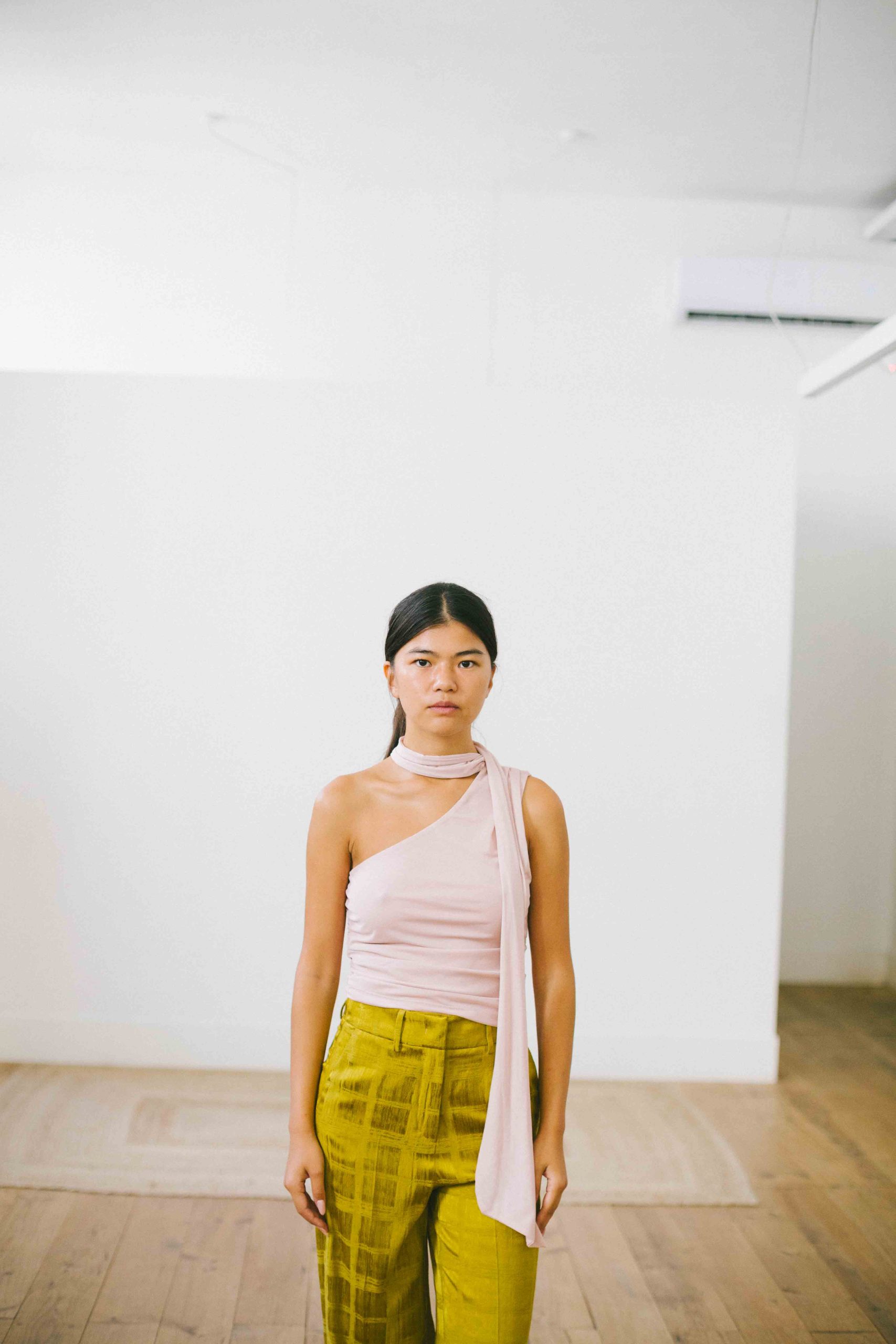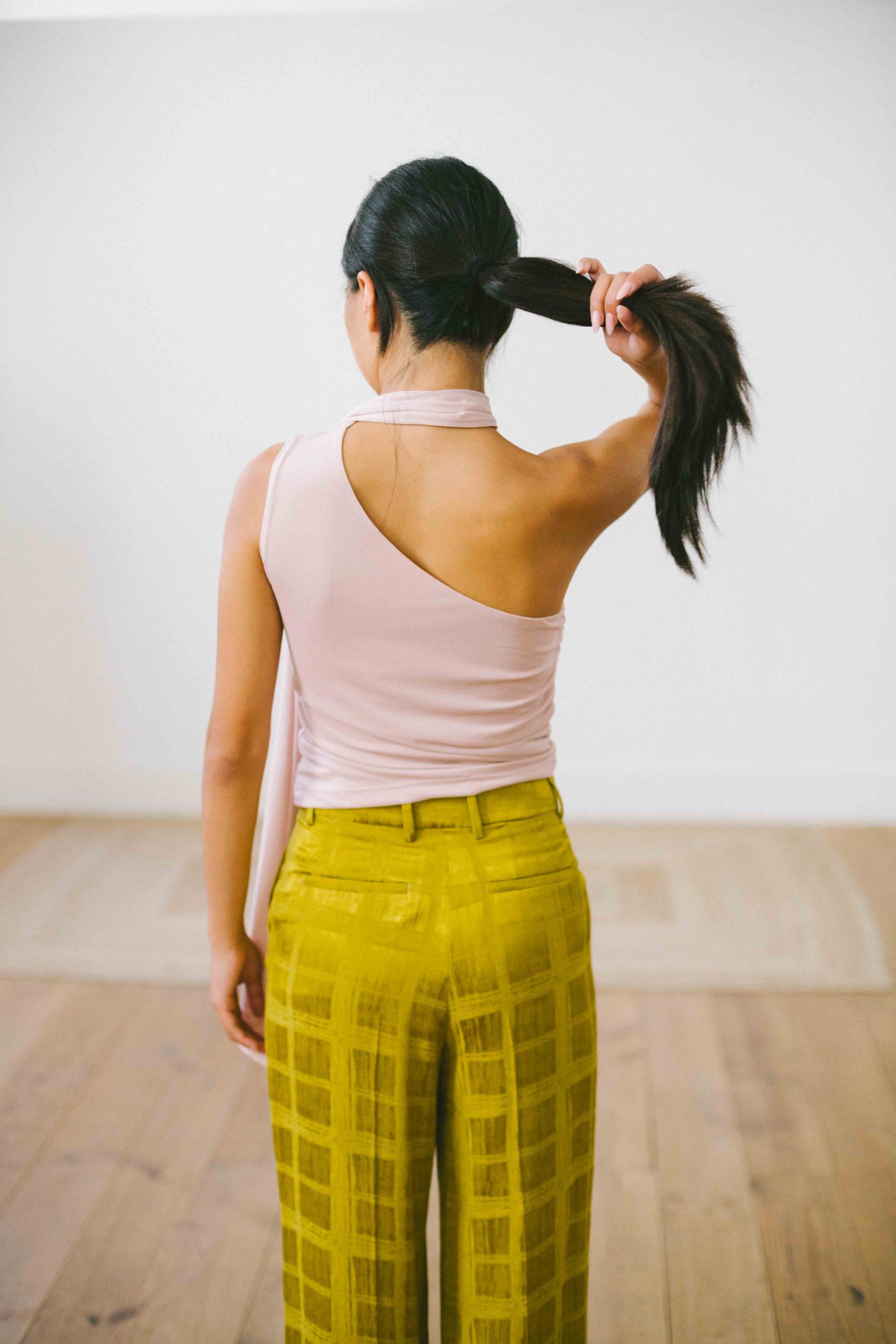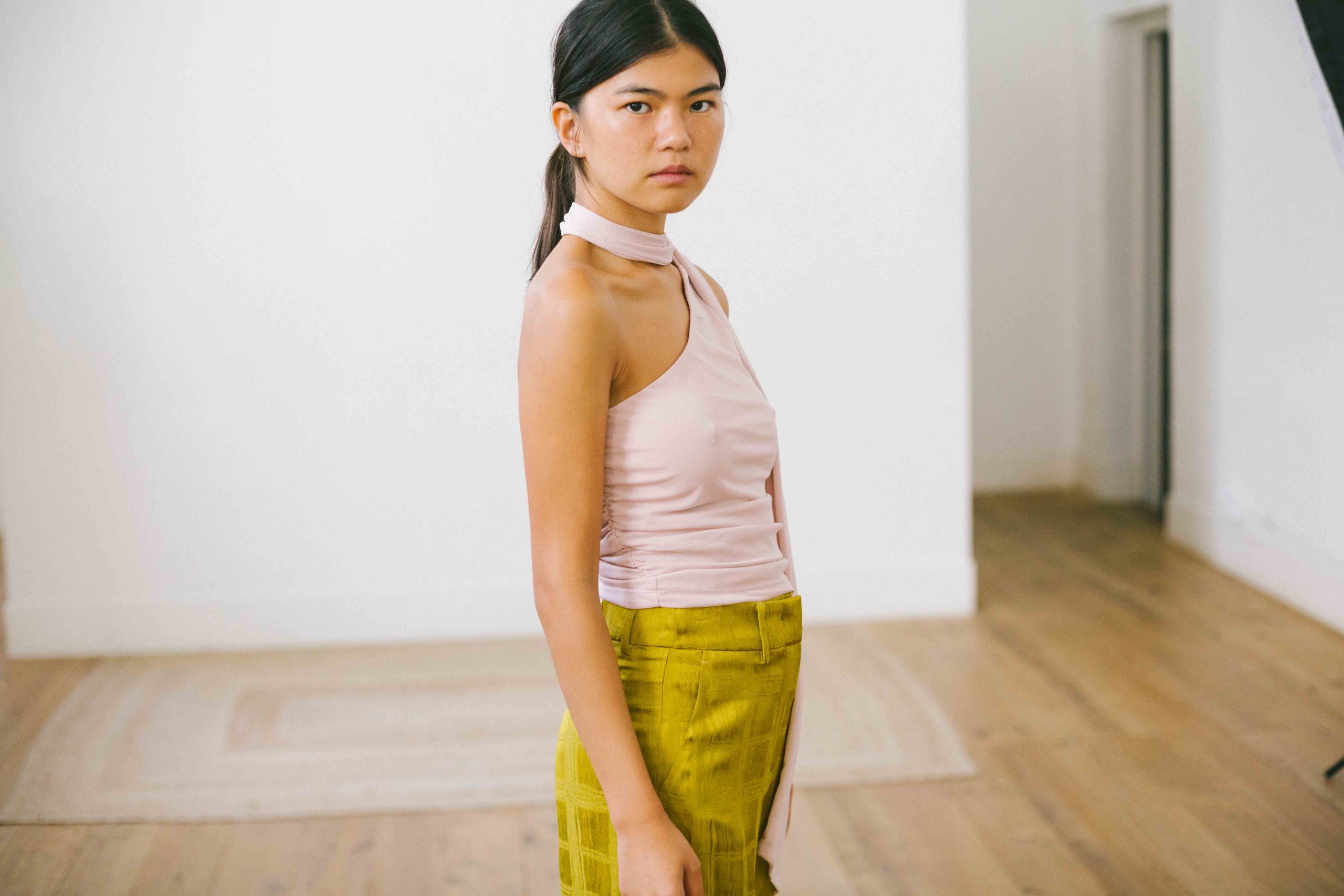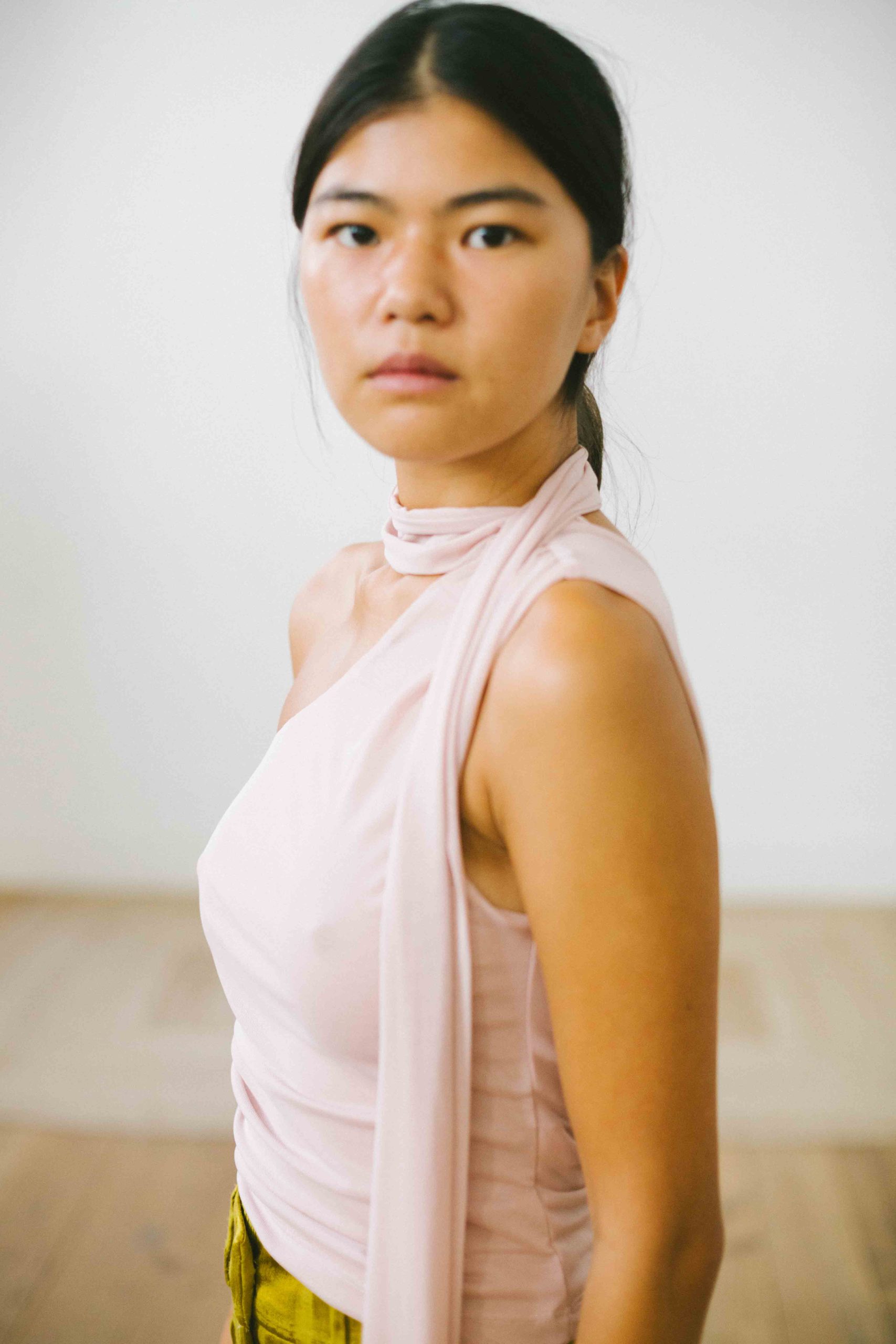 Top asimétrico con lazada cuello tul rosa palo t.S