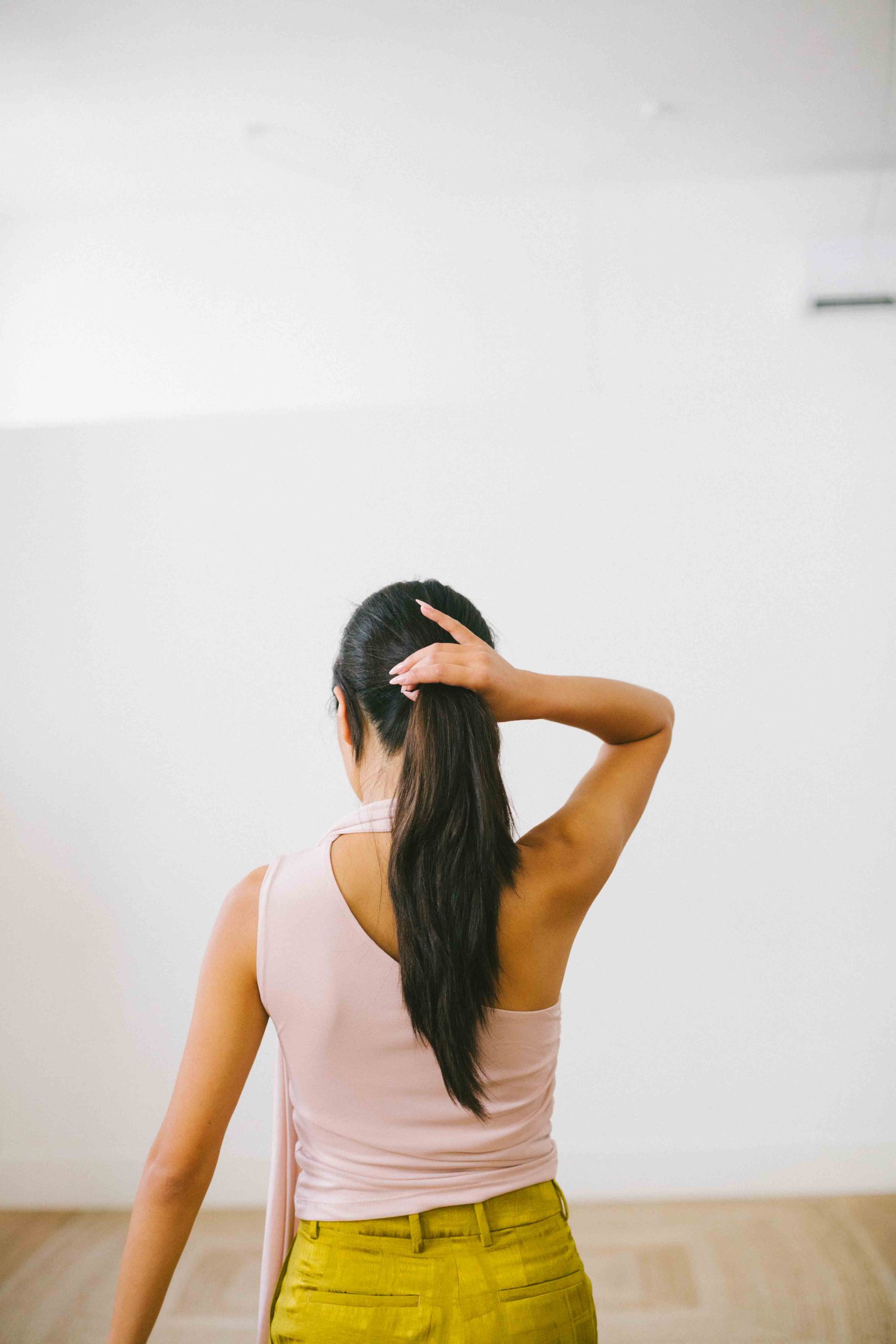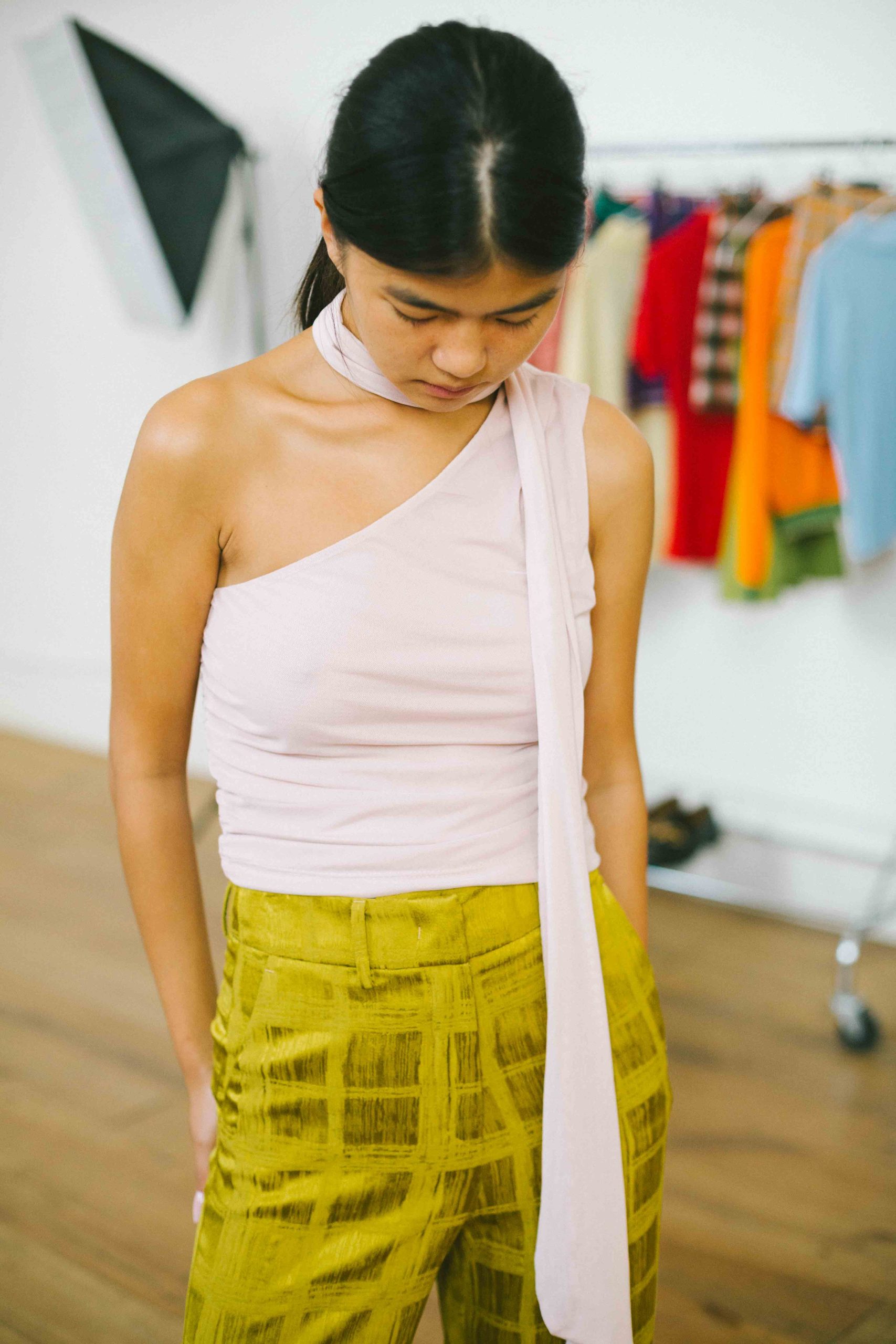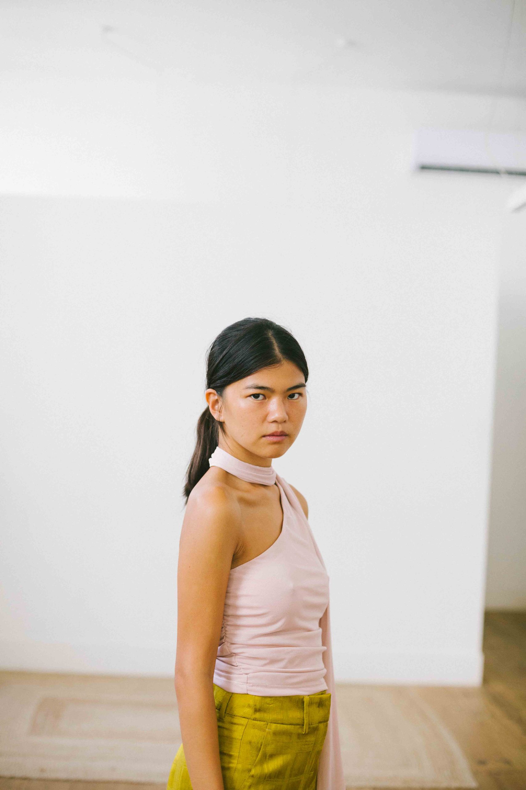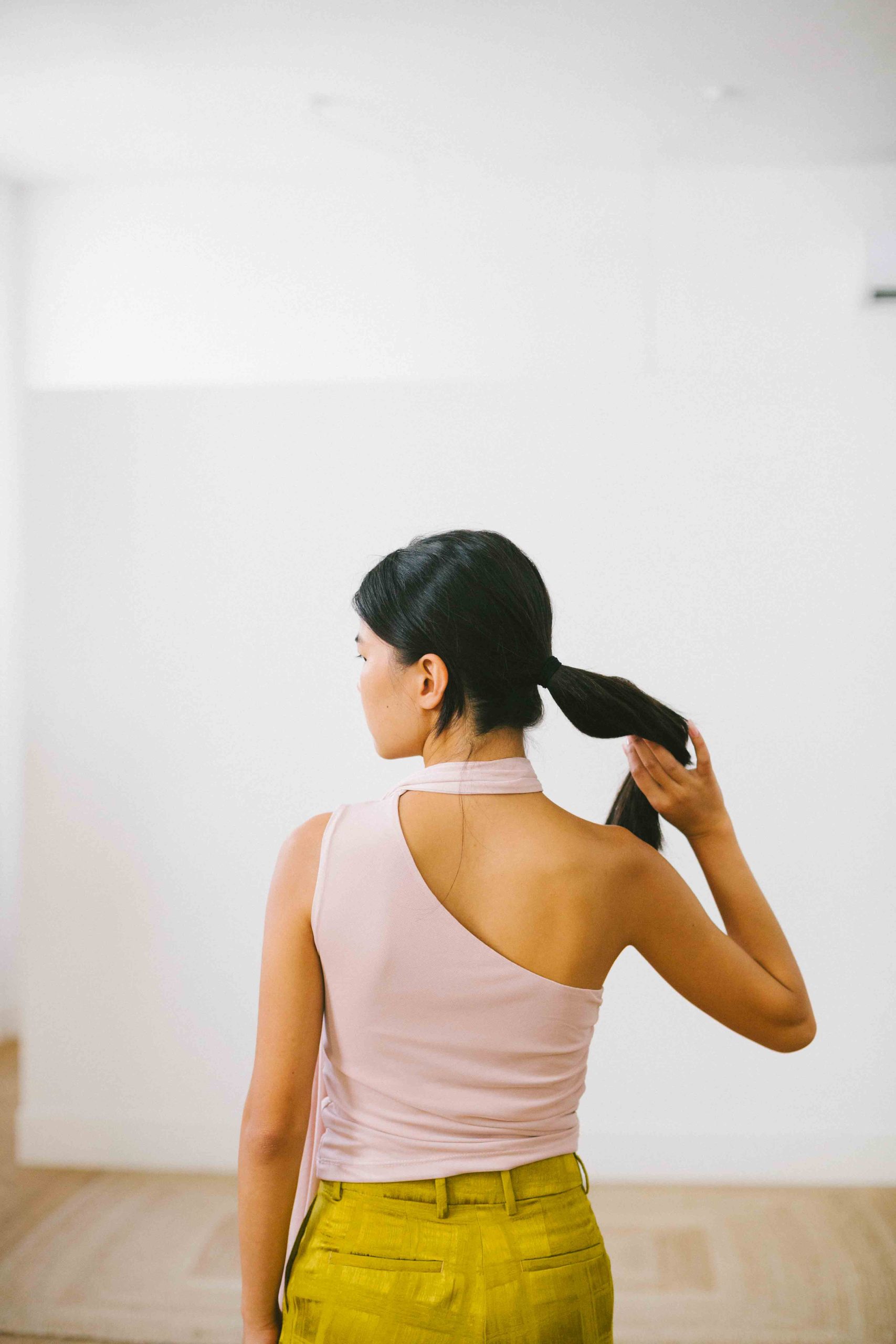 Top asimétrico con lazada cuello tul rosa palo t.S
