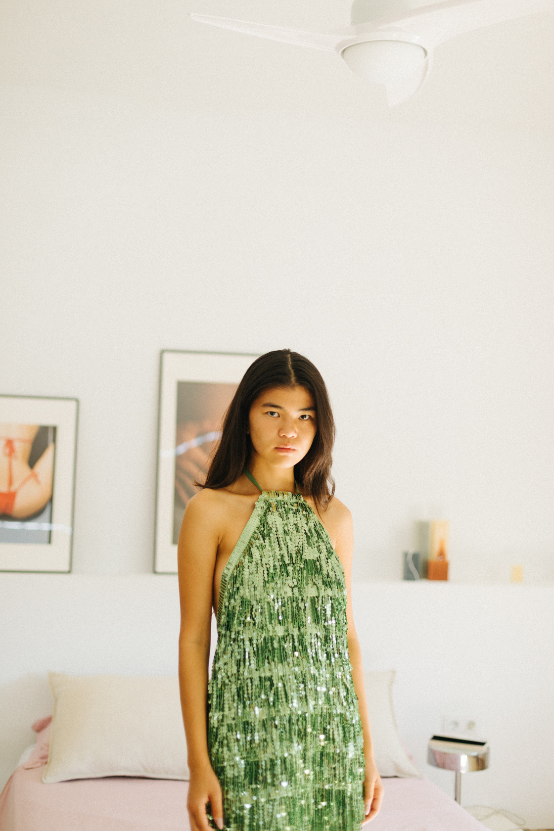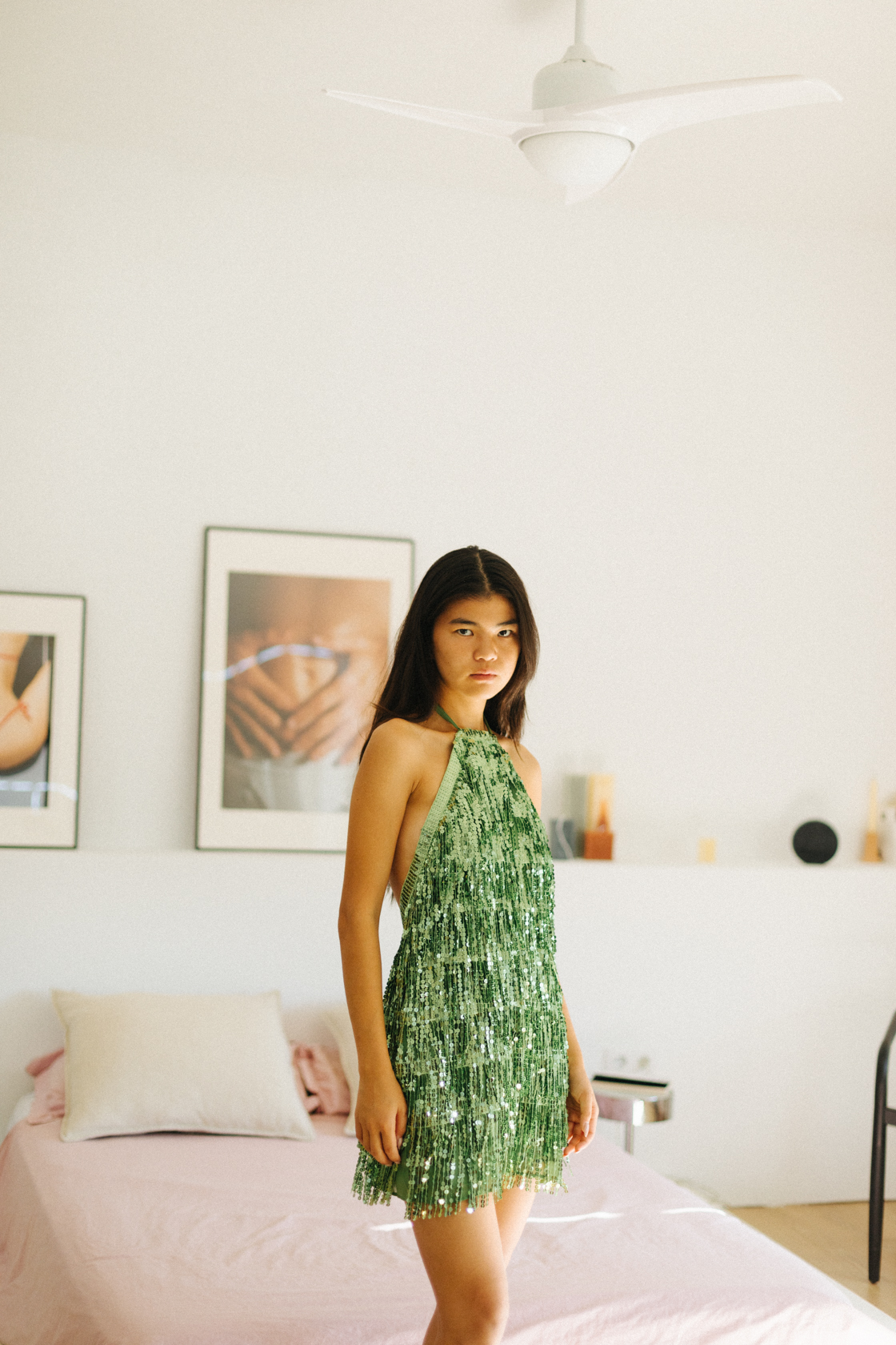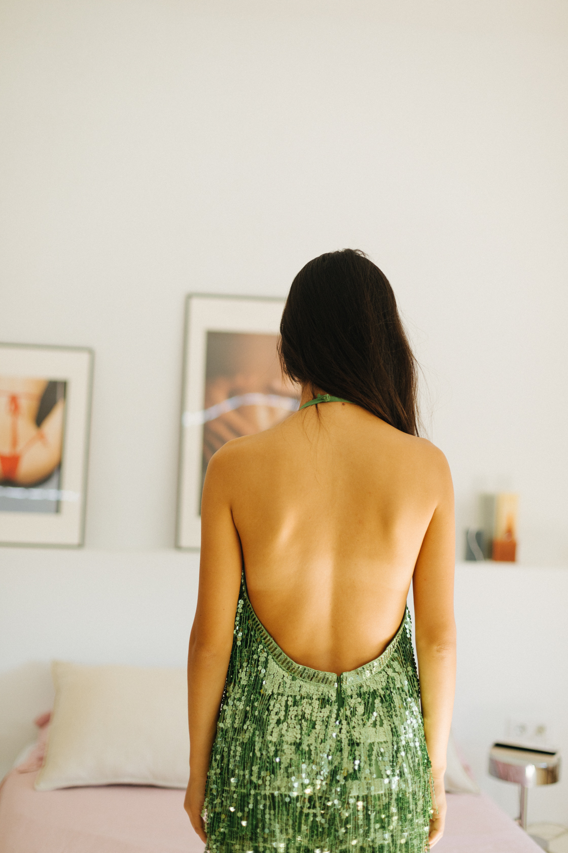 Vestido corto con flecos brillantes verde y cuello halter- S- Pull & Bear