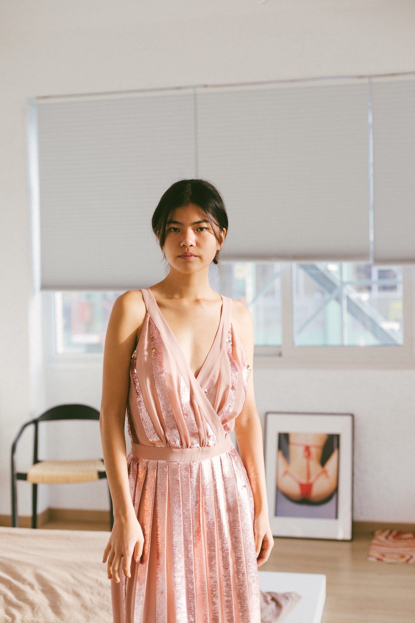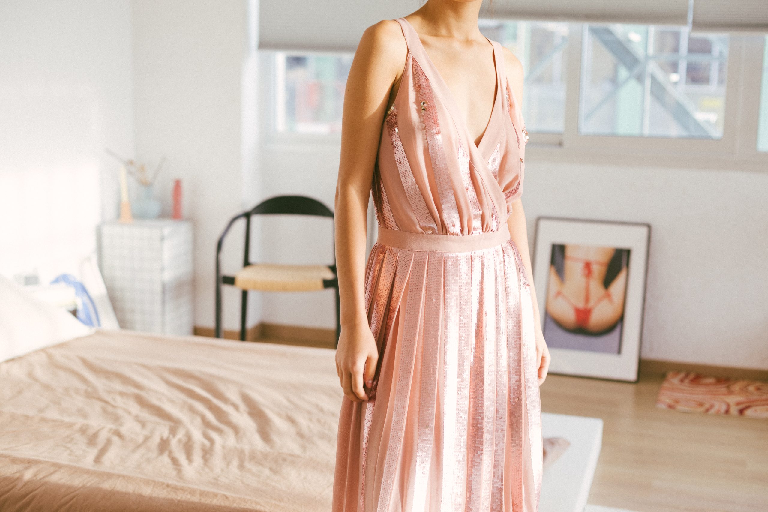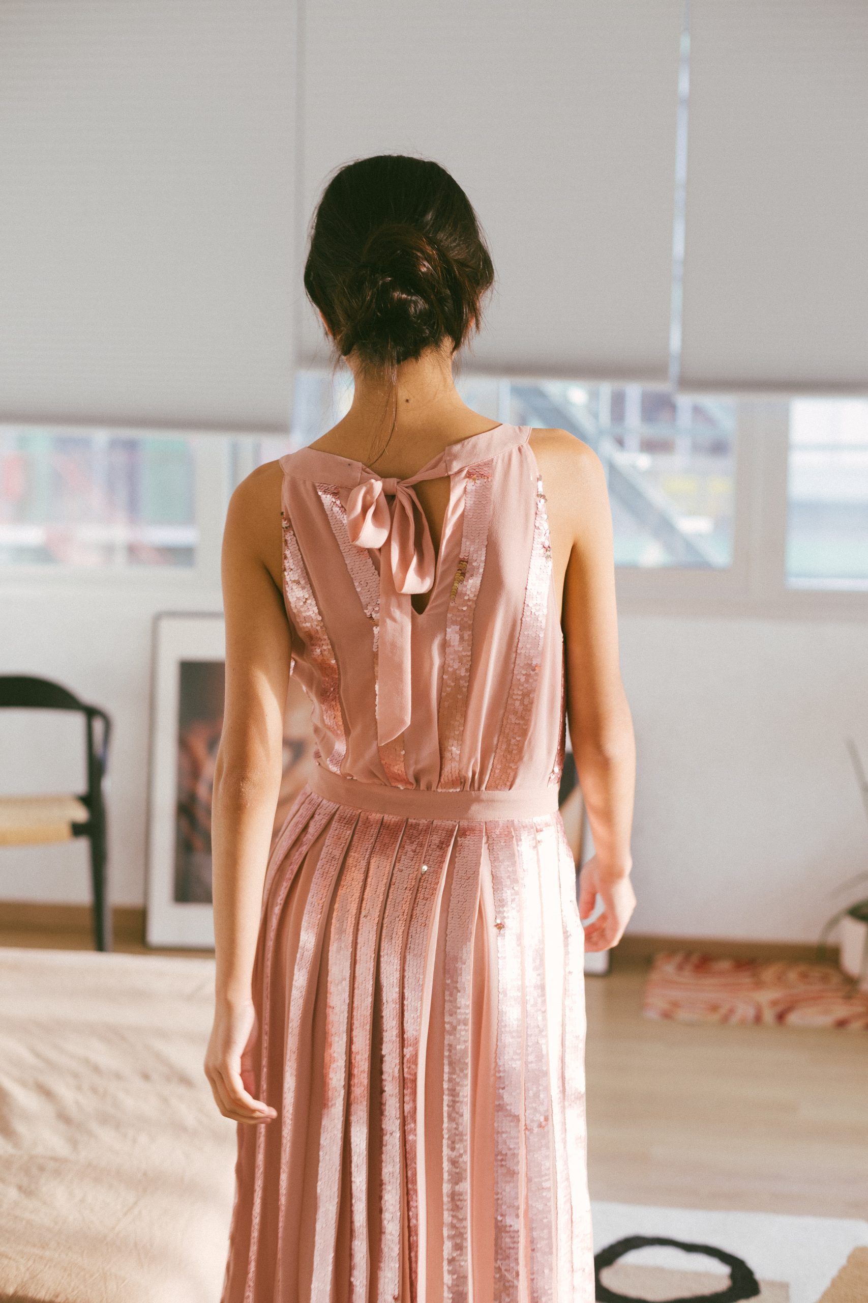 Vestido largo de rayas rosas de lentejuelas – S – Fraccomina