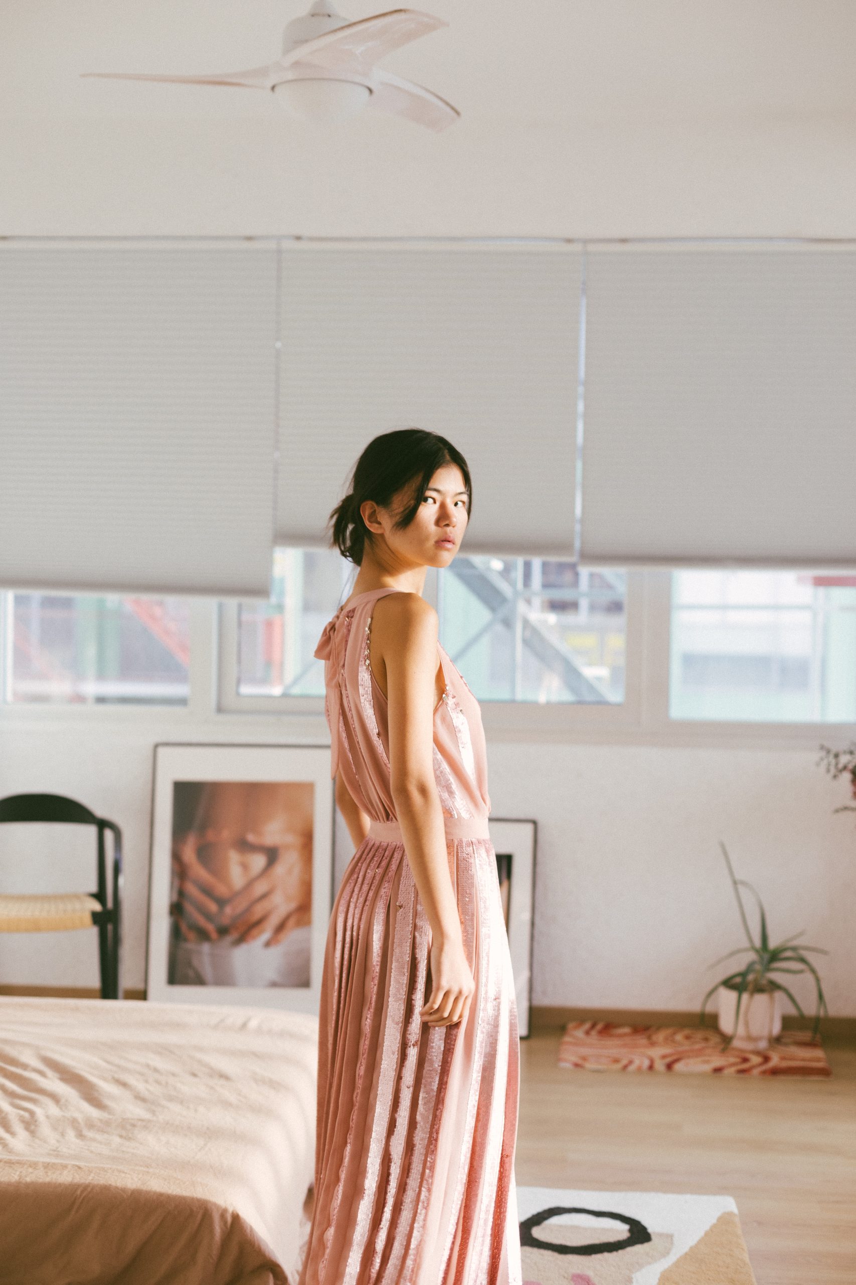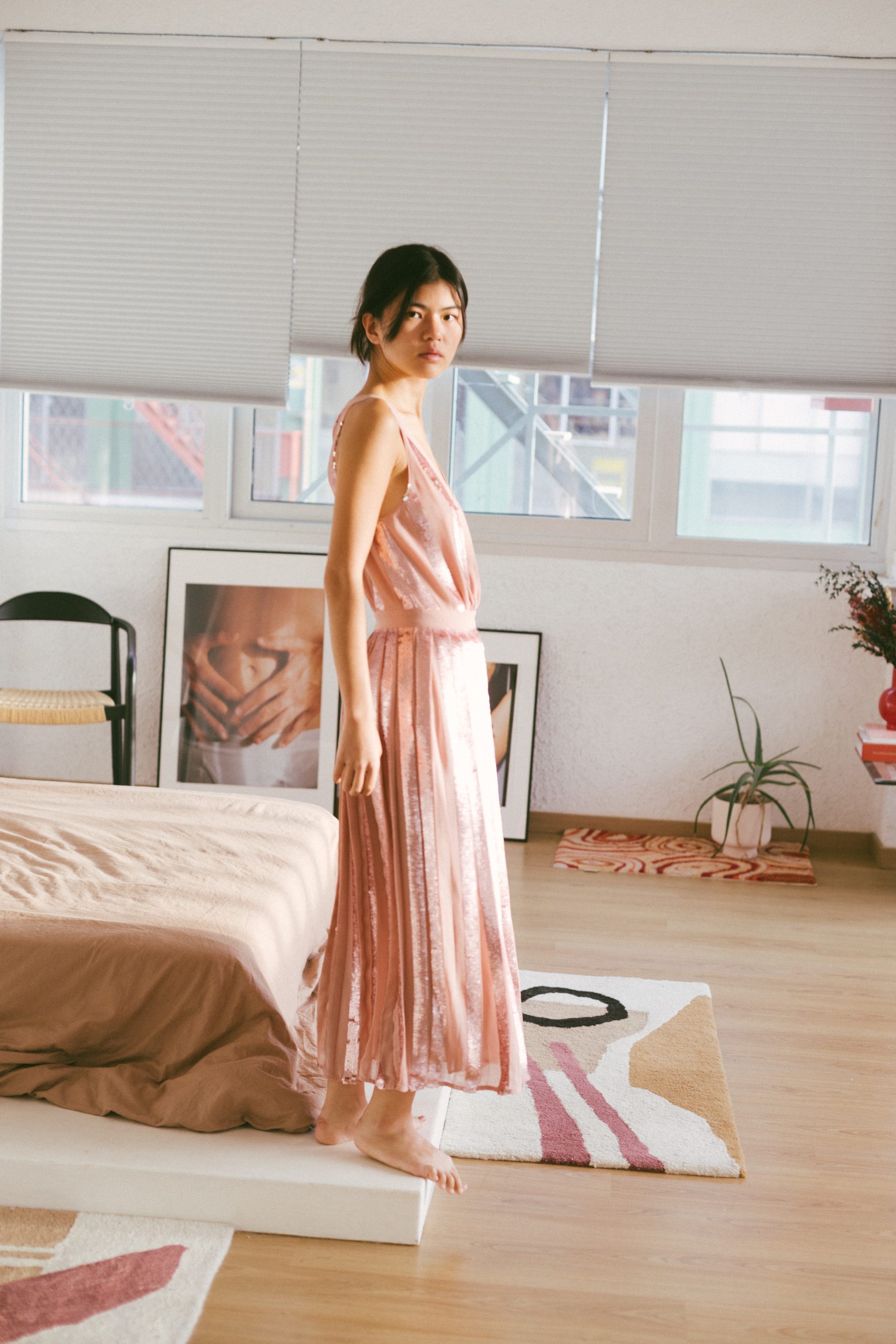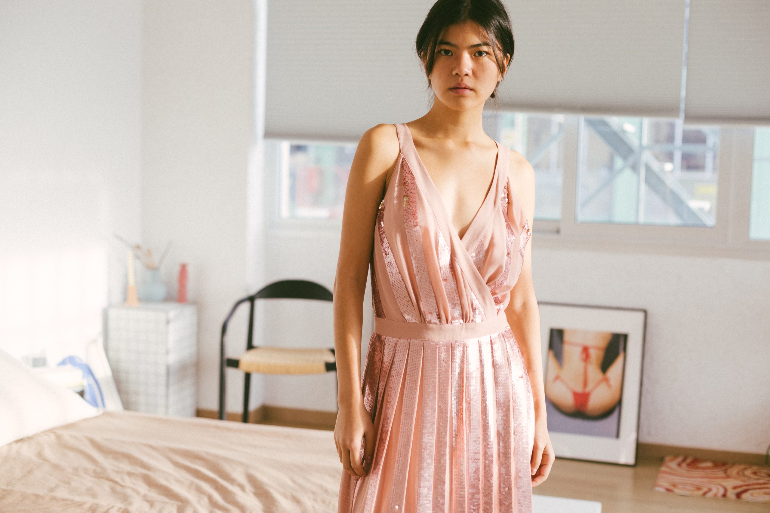 Vestido largo de rayas rosas de lentejuelas – S – Fraccomina