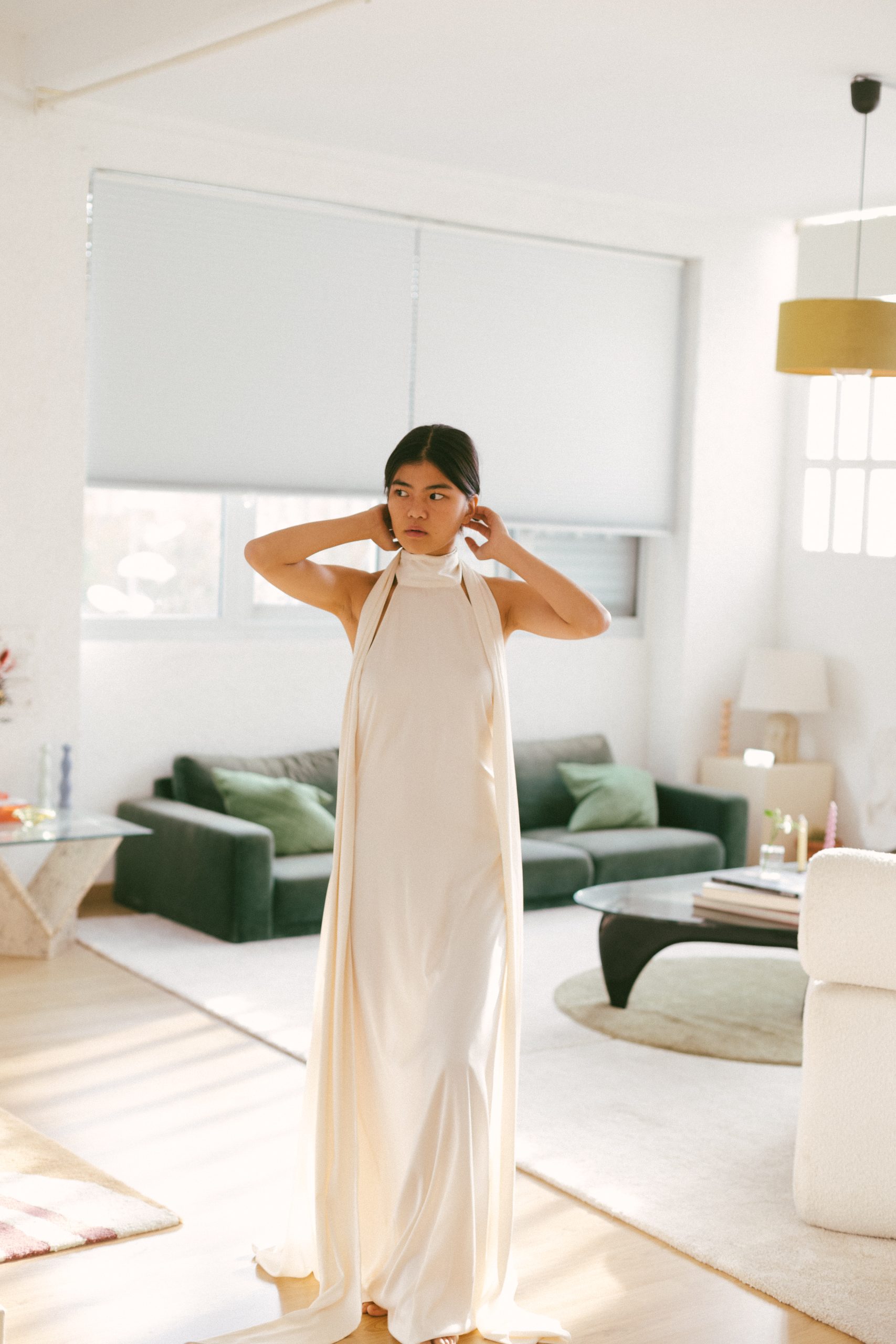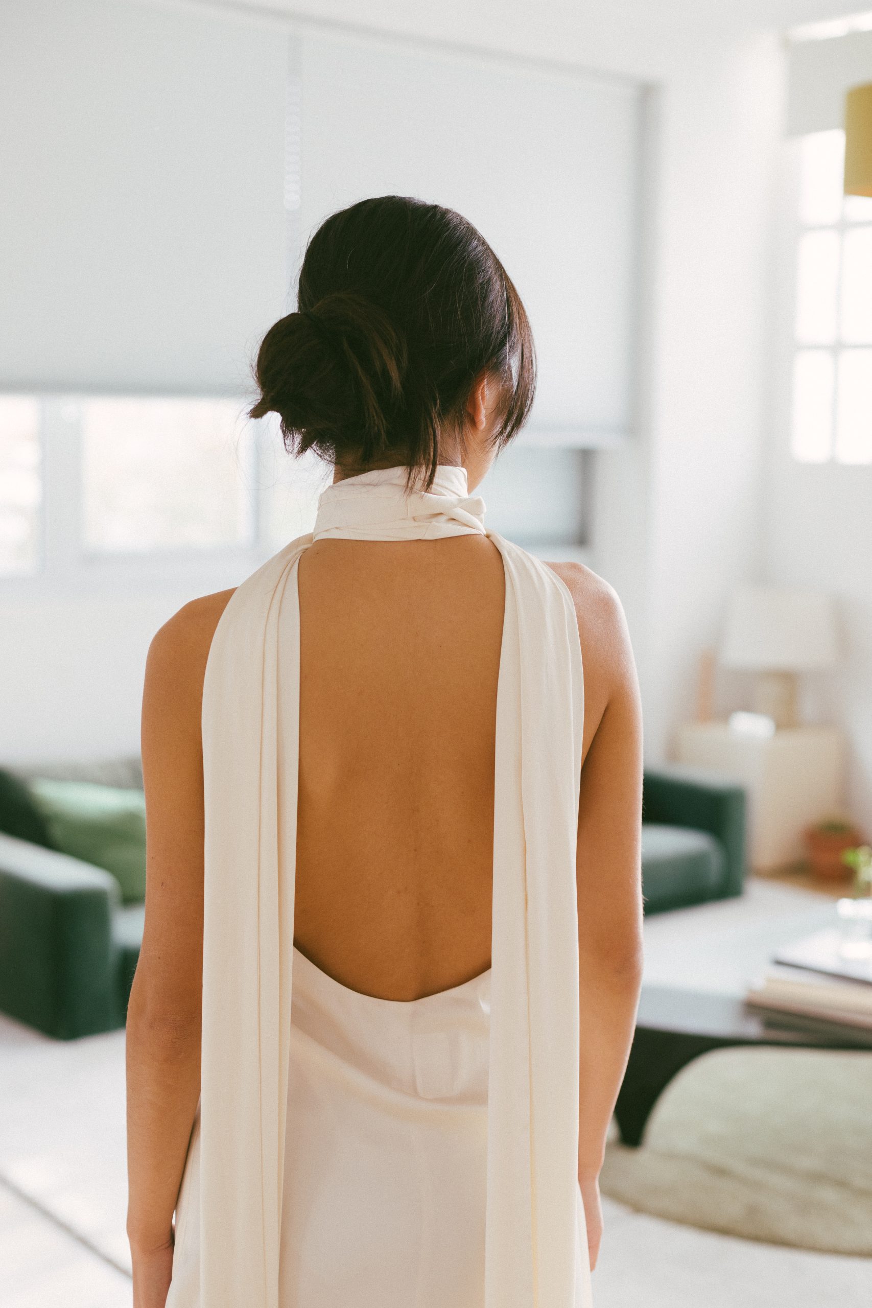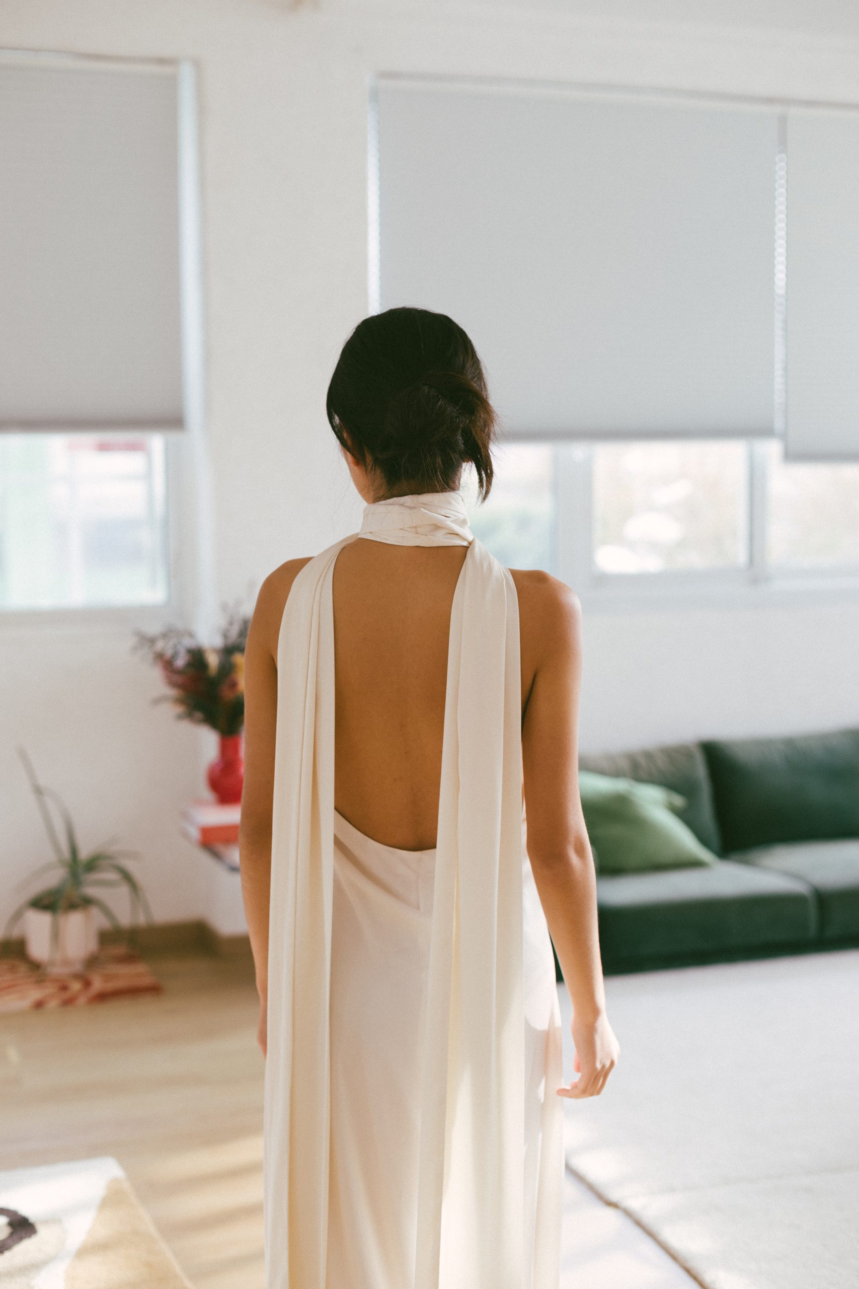 Vestido largo blanco espalda abierta con pañuelo