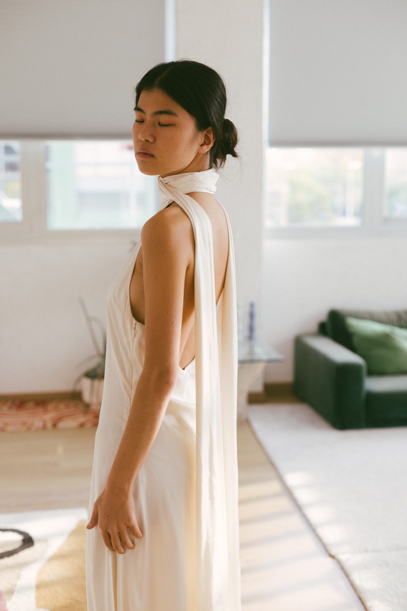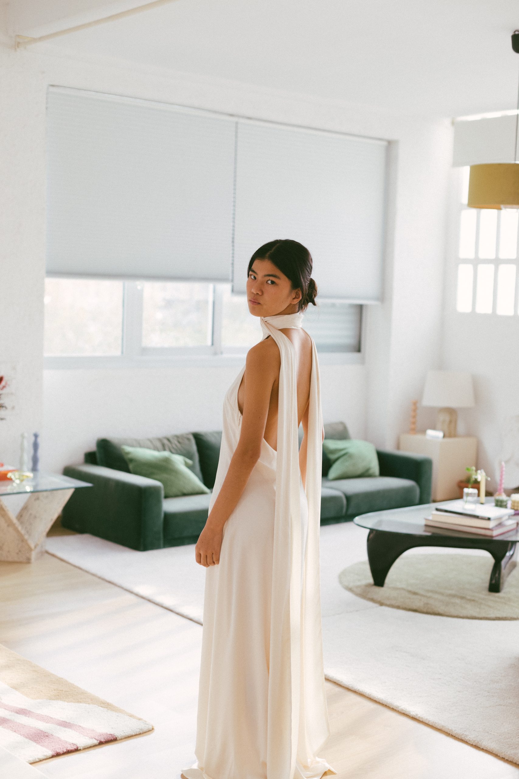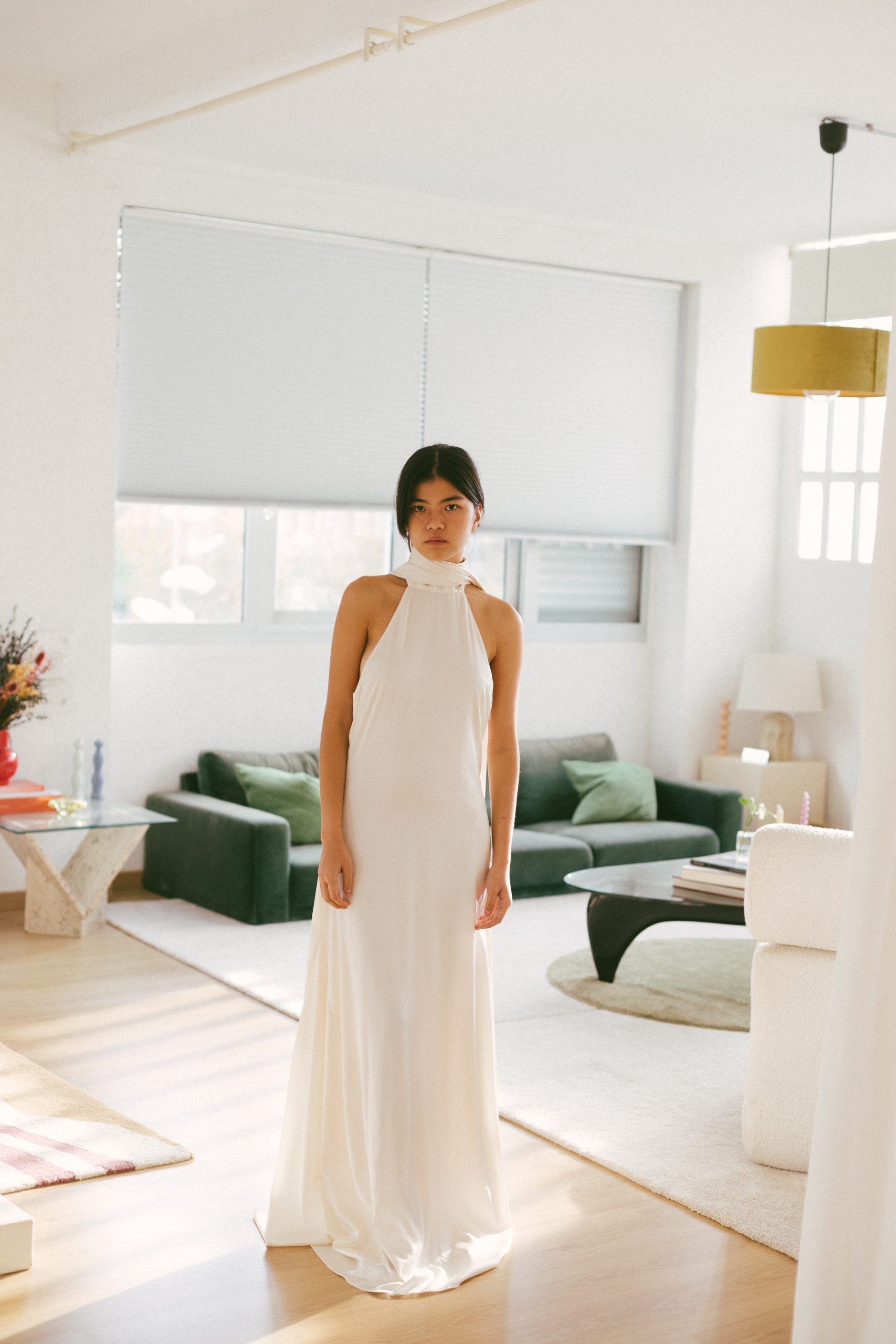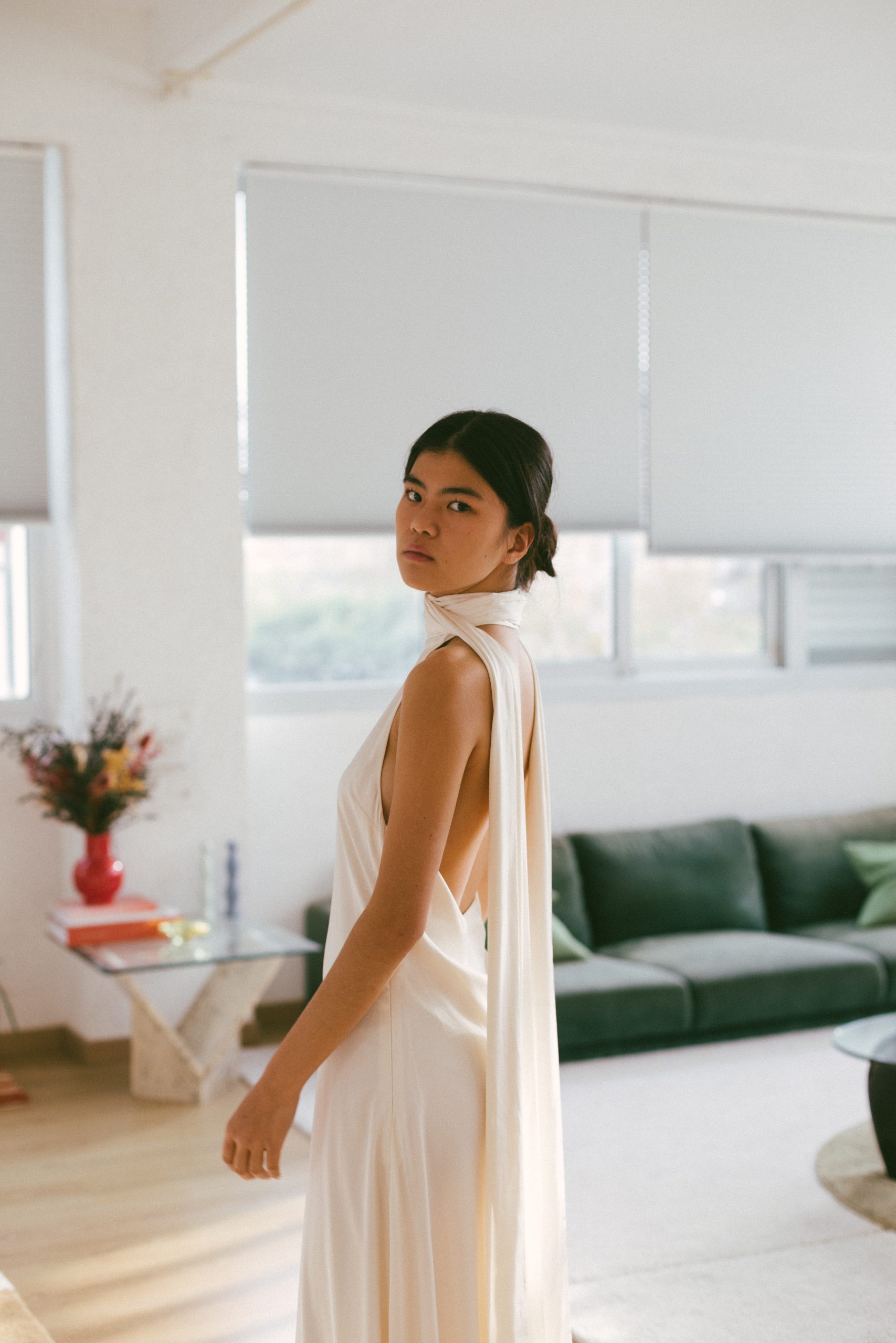 Vestido largo blanco espalda abierta con pañuelo