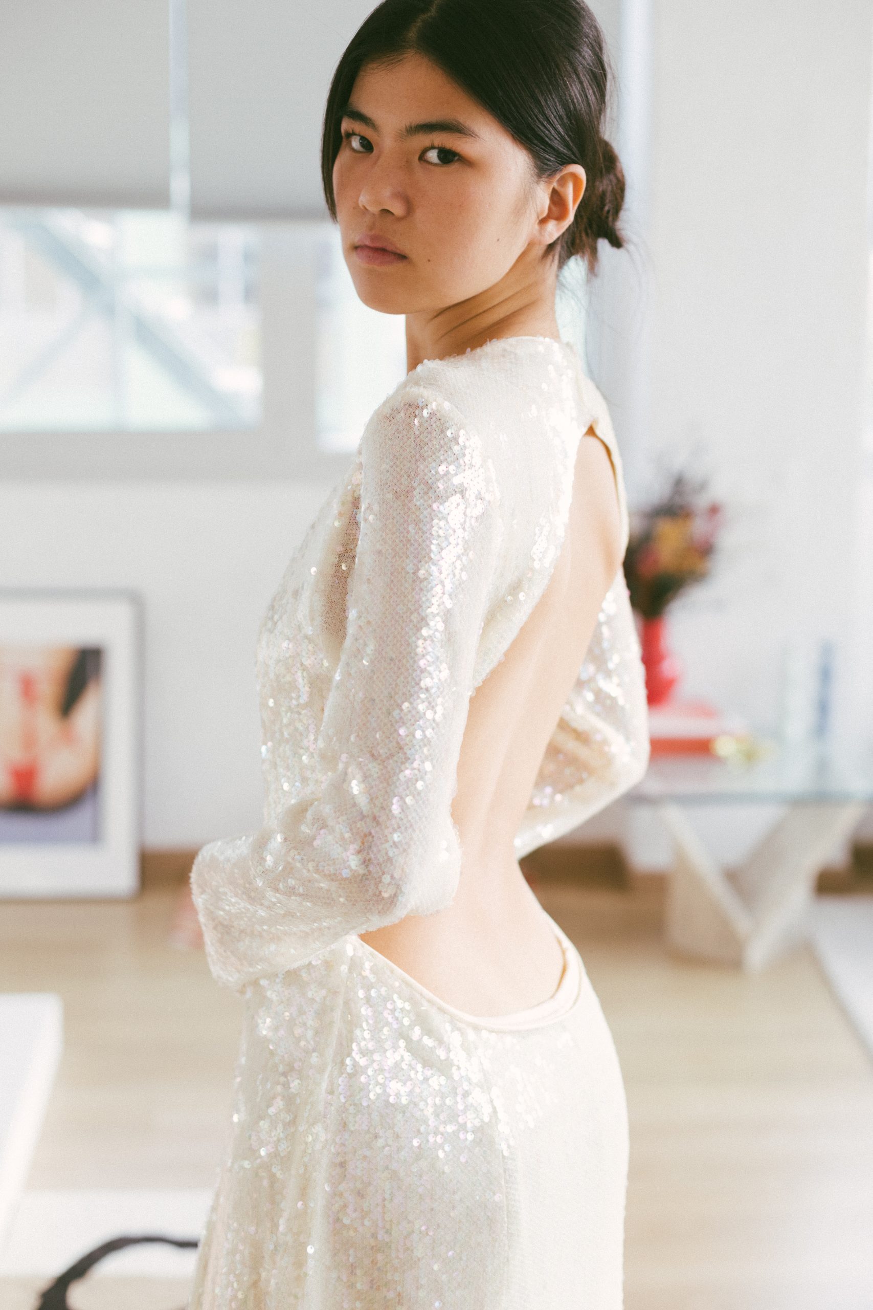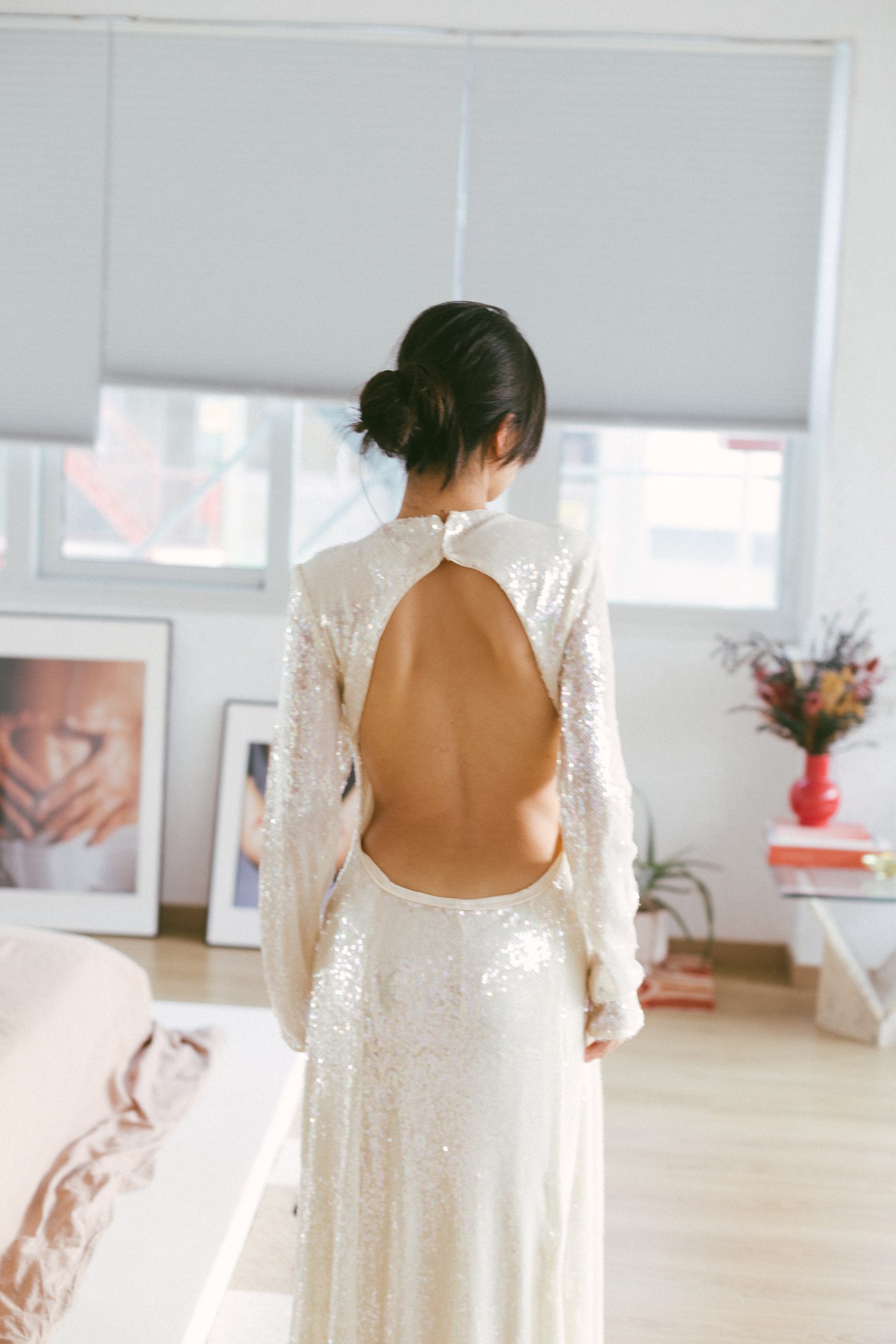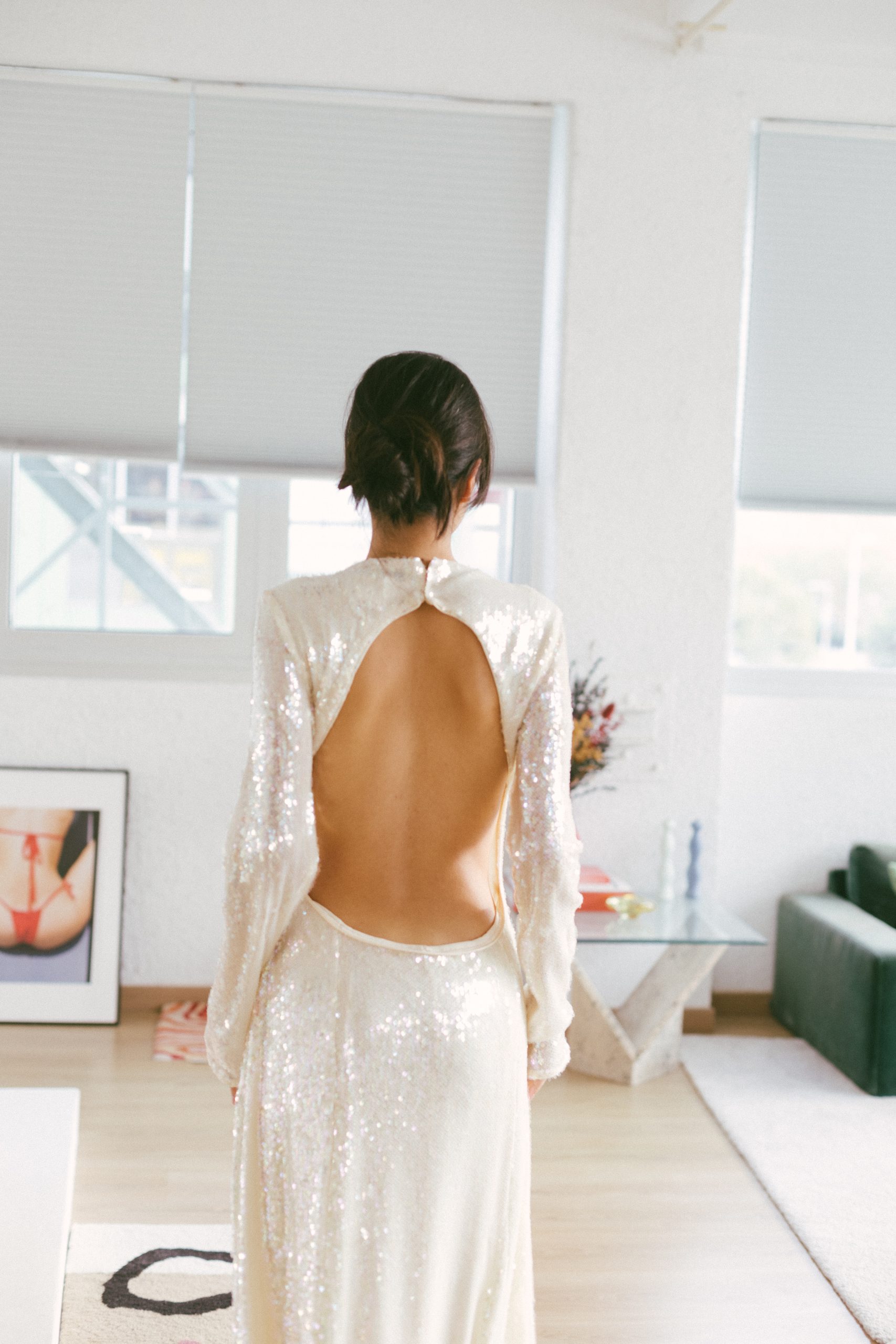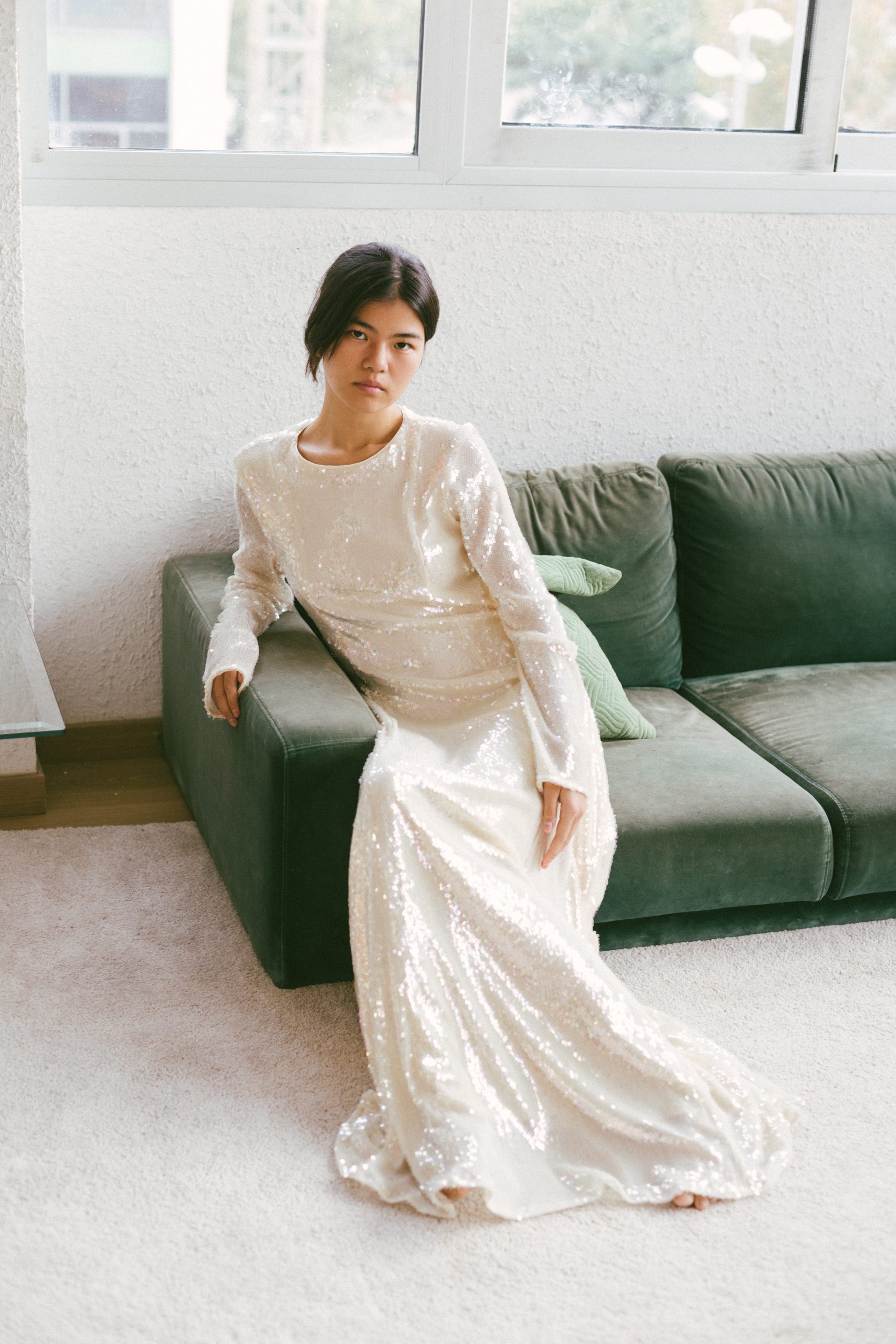 Vestido largo manga larga con lentejuelas blancas