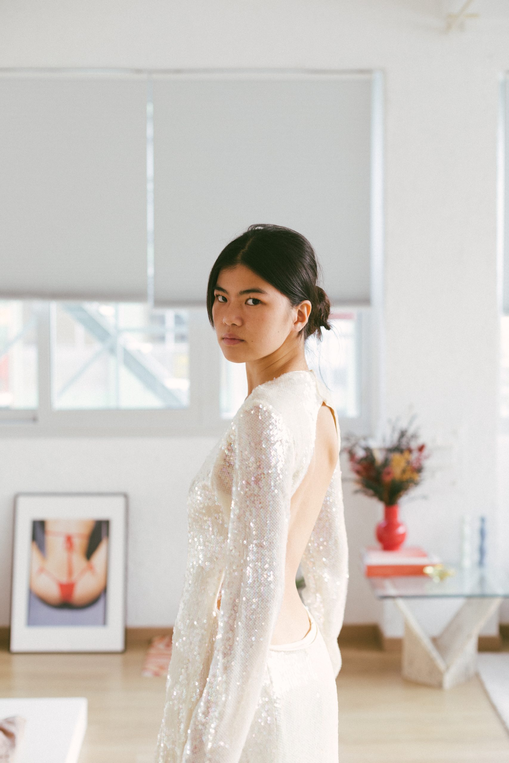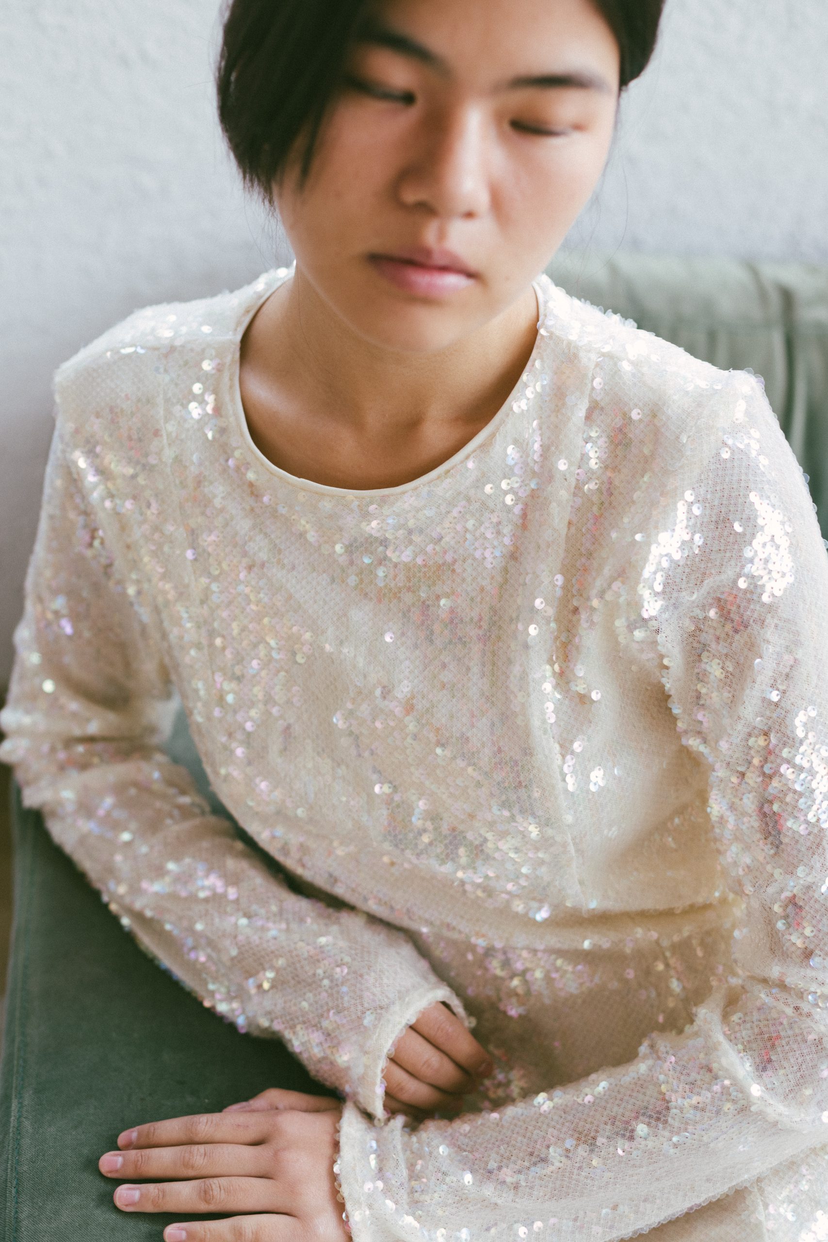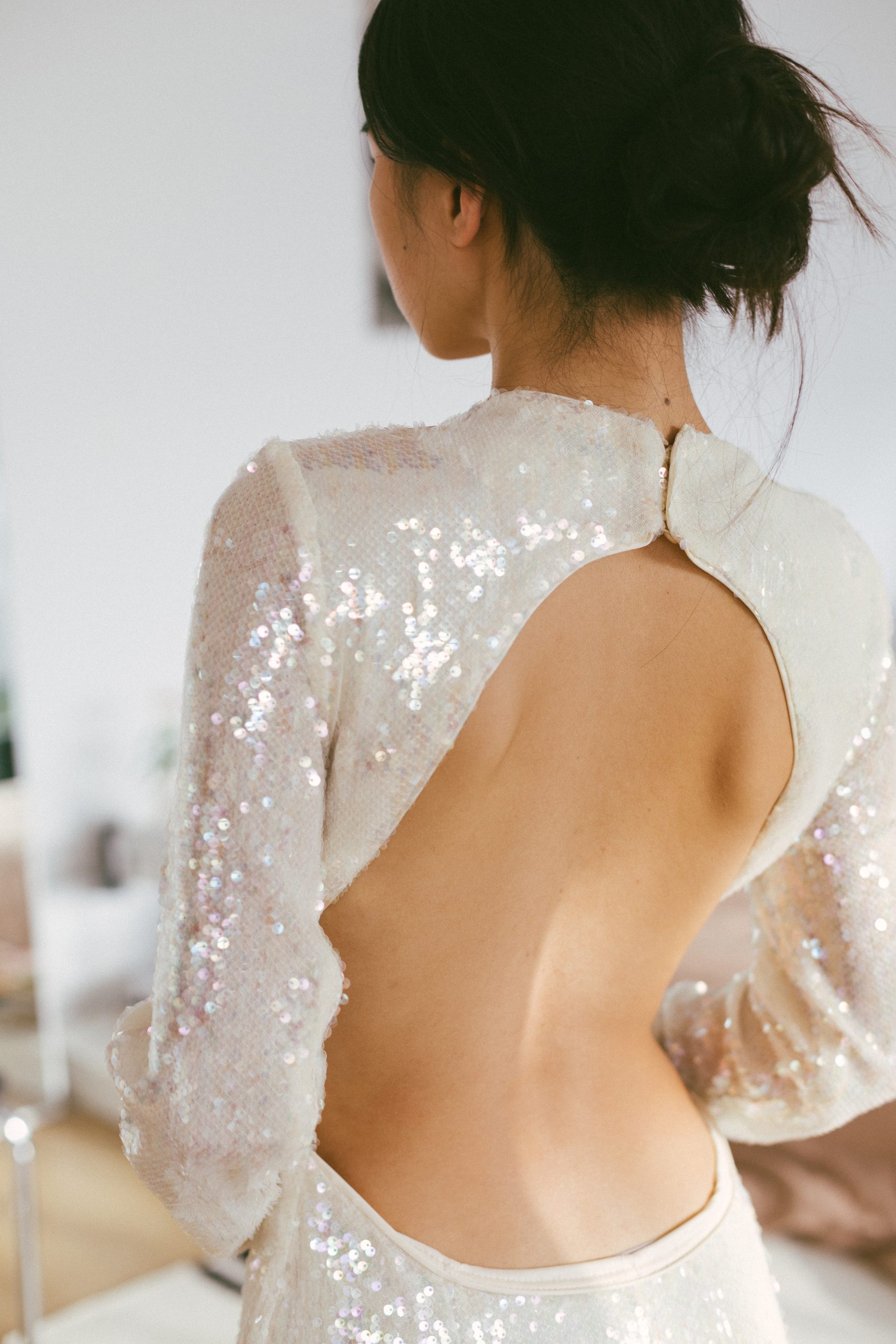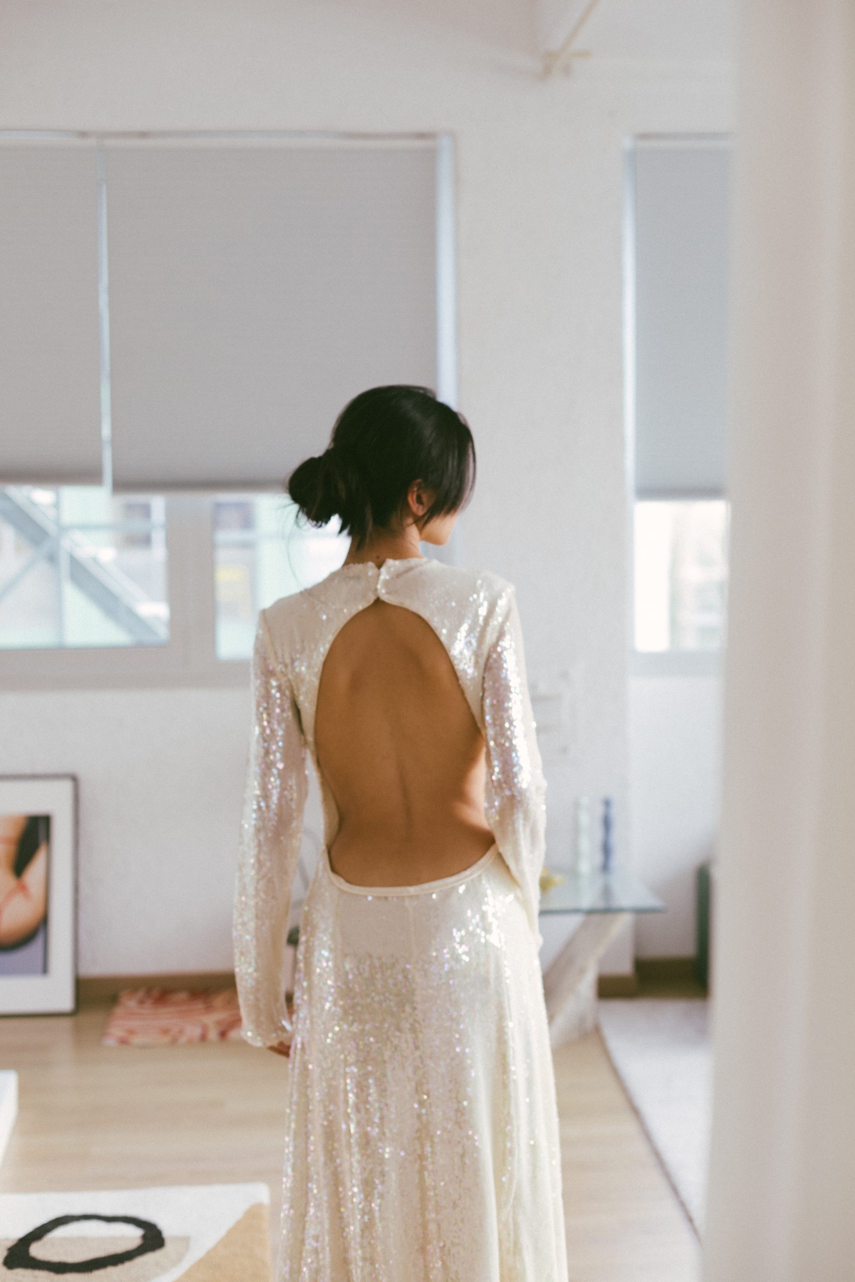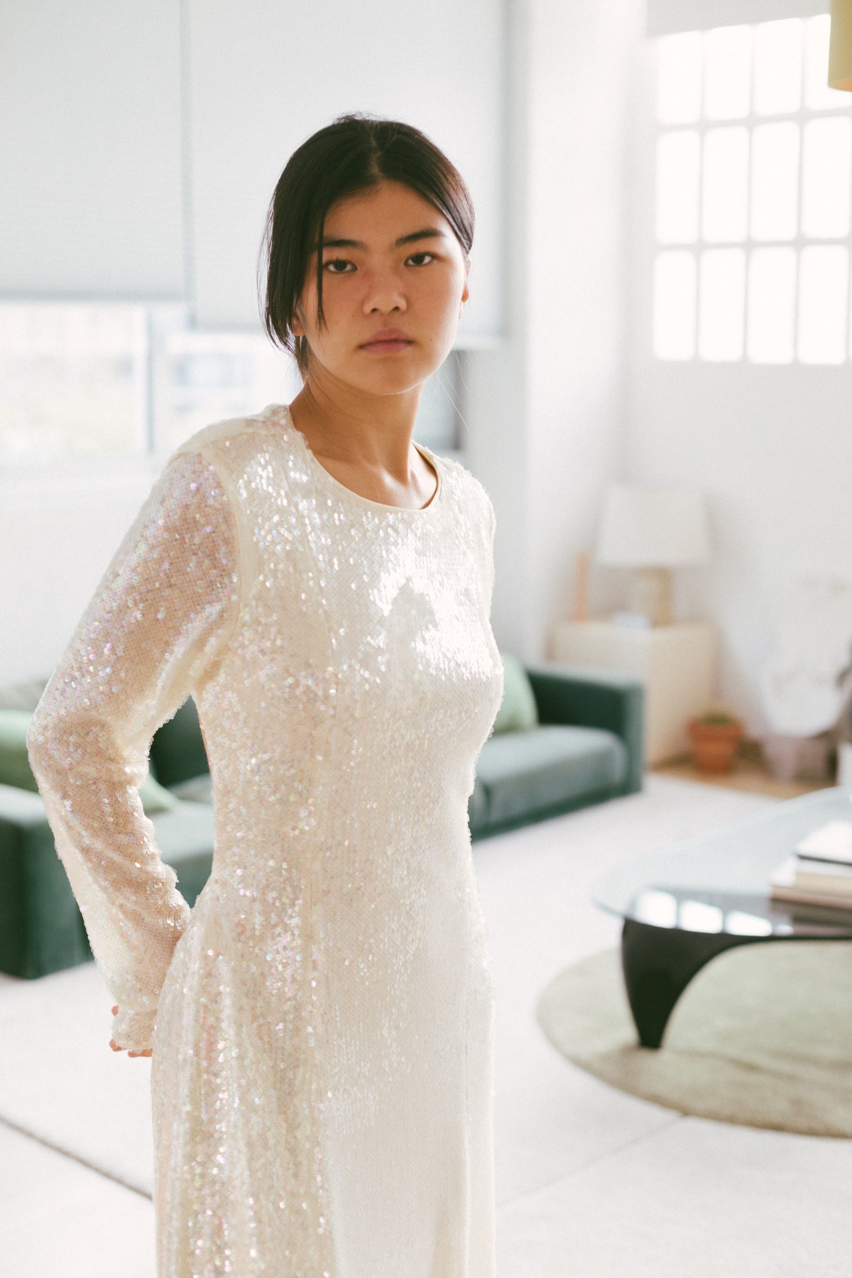 Vestido largo manga larga con lentejuelas blancas