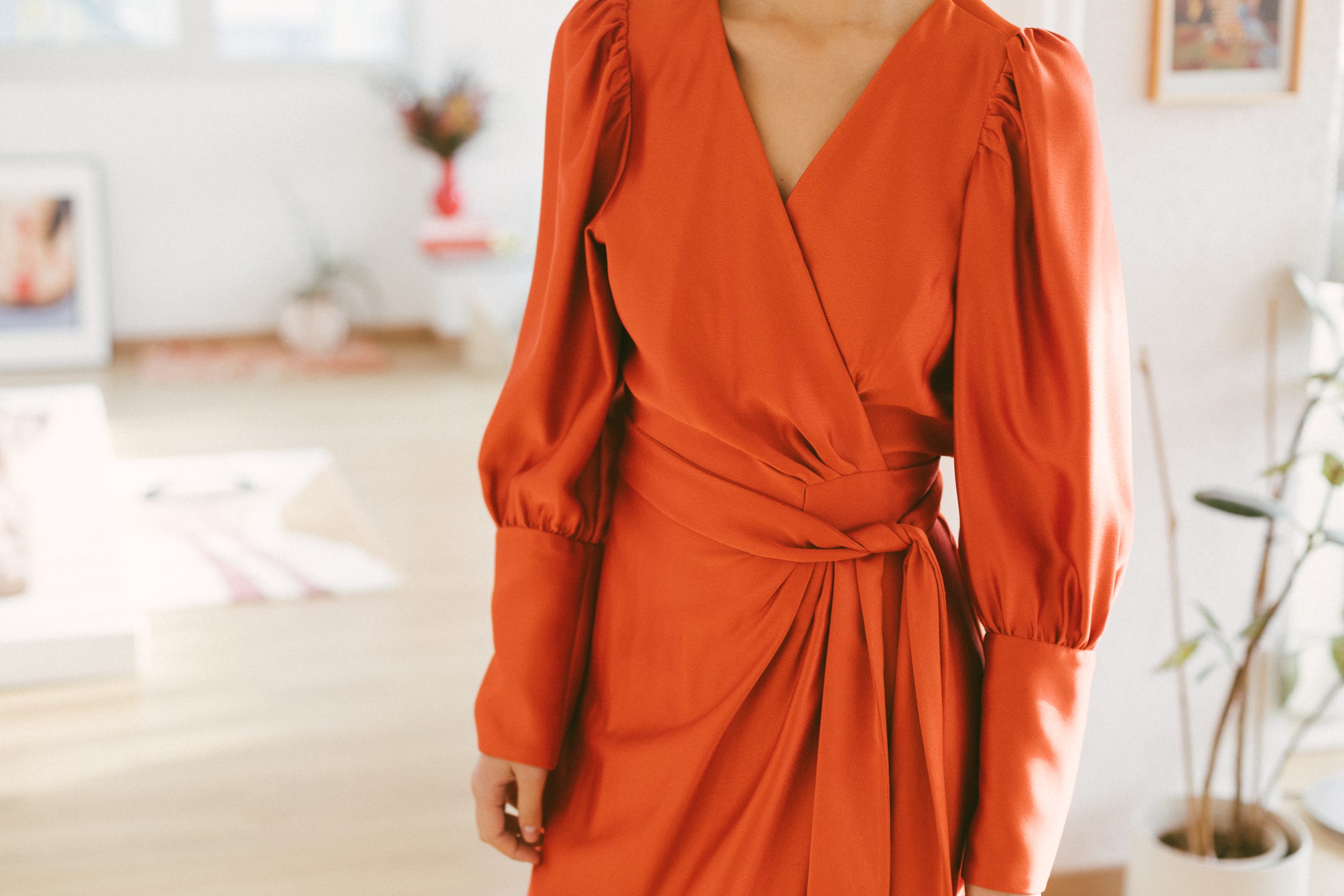 Vestido largo naranja satén cruzado de manga larga-38-PURIFICACIÓN GARCÍA