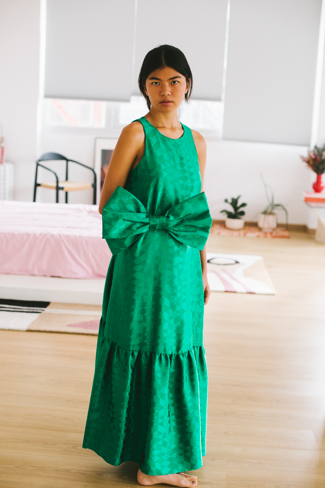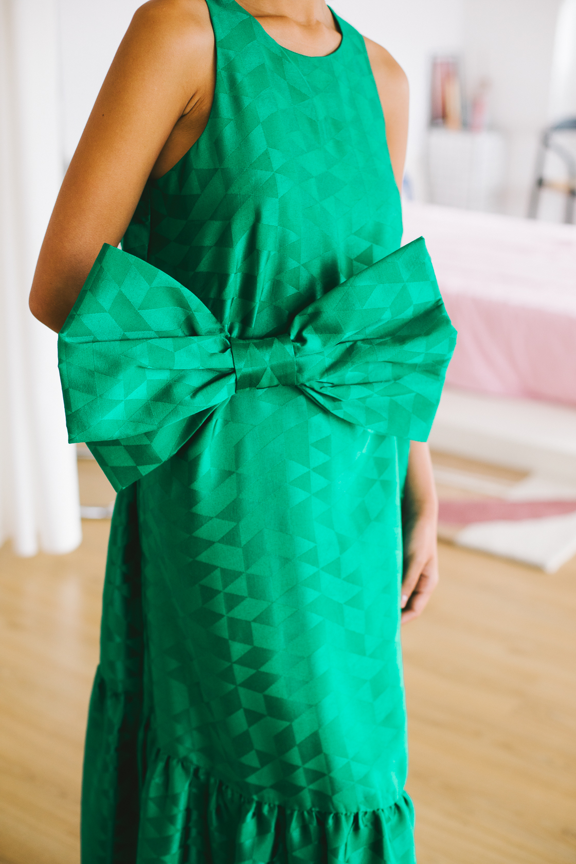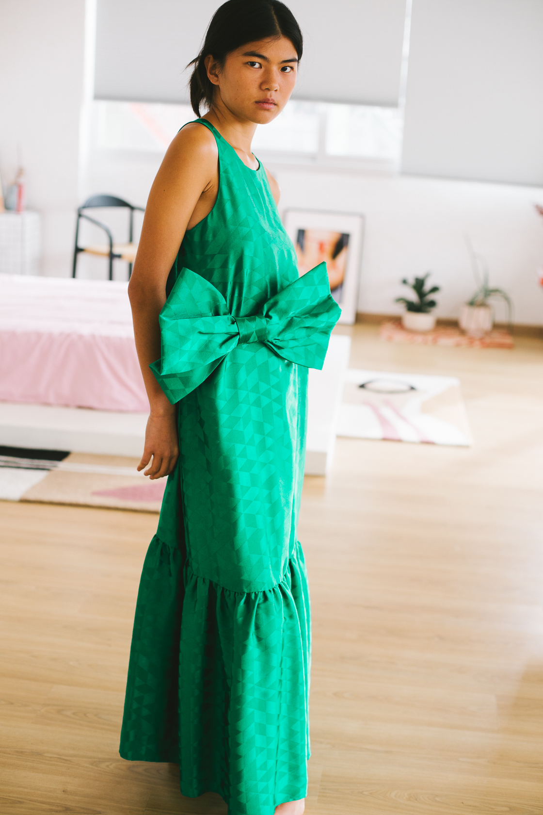 Vestido largo verde satinado lazo grande – S – FJ